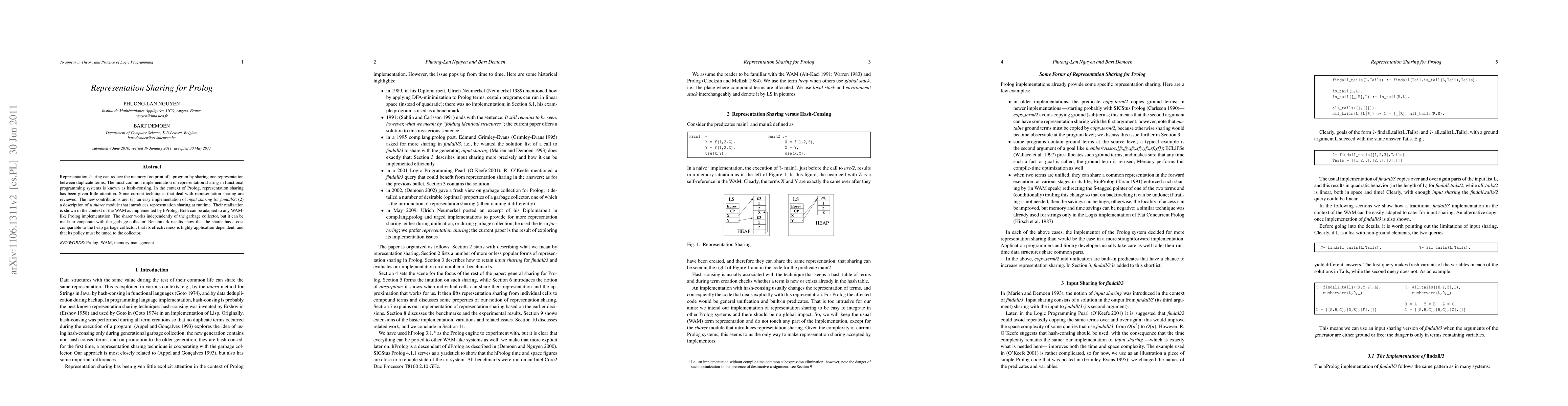 This paper introduces techniques for representation sharing in Prolog, focusing on reducing memory usage by sharing identical terms. It presents an implementation of input sharing for findall/3 and a sharer module that enables runtime sharing, demonstrating its integration with the WAM in hProlog. Benchmark results indicate that the sharer's effectiveness varies with applications and requires tuning to optimize performance.
