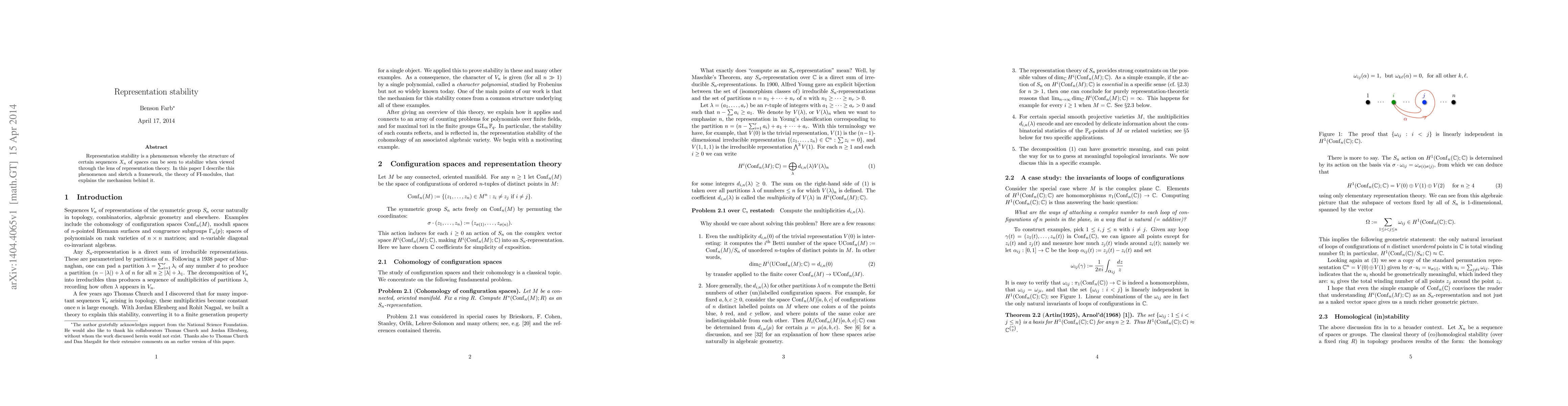 Summary: This paper explores the concept of representation stability, where sequences of spaces exhibit stable structures under representation theory, and introduces the theory of FI-modules as a framework to explain this phenomenon.