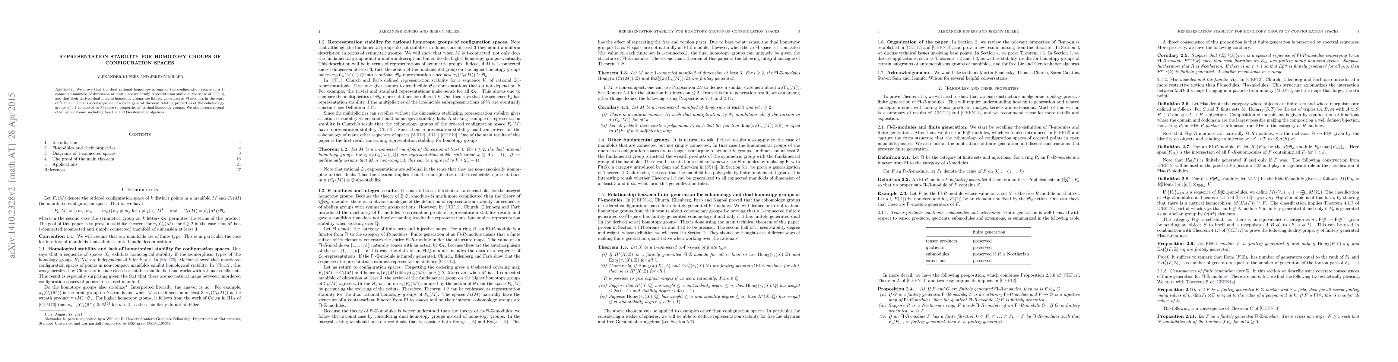 The paper establishes uniform representation stability for the dual rational homotopy groups of configuration spaces on 1-connected manifolds of dimension at least 3, and proves their derived dual integral homotopy groups are finitely-generated as FI-modules, based on a broader theorem connecting co-FI-space cohomology and homotopy group properties. The findings have various applications in homotopy theory.