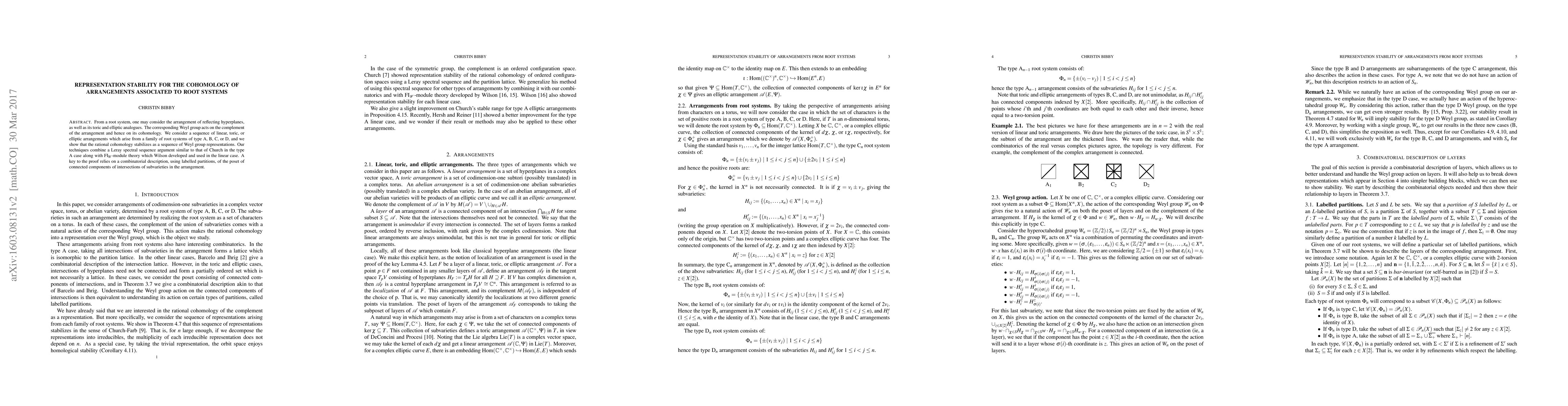 This paper demonstrates the stability of the rational cohomology for sequences of arrangements derived from root systems, showing it stabilizes as Weyl group representations. The proof employs a combination of Leray spectral sequence methods and FI$_W$-module theory, with a crucial combinatorial approach using labelled partitions to describe intersections.