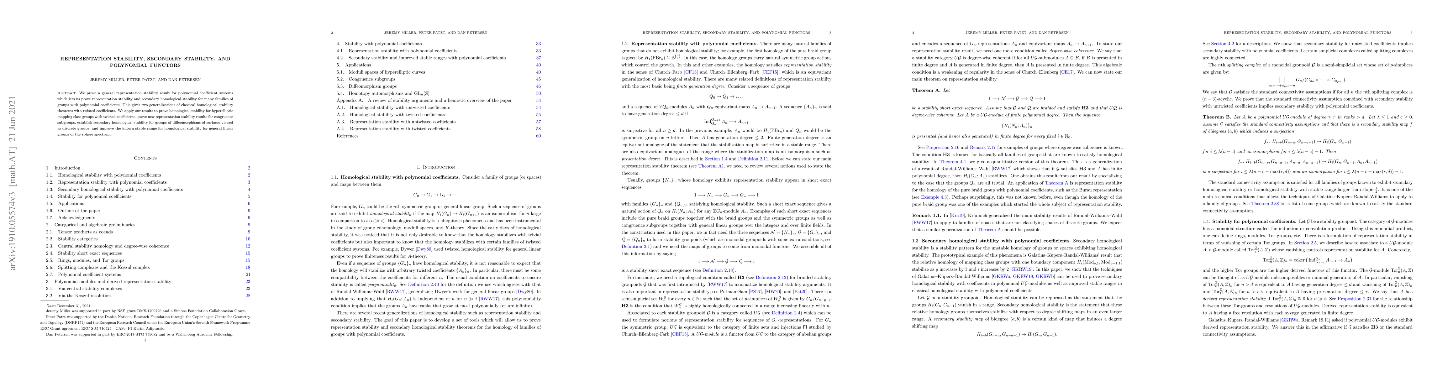 We prove a general representation stability result for polynomial coefficient systems which lets us prove representation stability and secondary homological stability for many families of groups with polynomial coefficients. This gives two generalizations of classical homological stability theorems with twisted coefficients. We apply our results to prove homological stability for hyperelliptic mapping class groups with twisted coefficients, prove new representation stability results for congruence subgroups, establish secondary homological stability for groups of diffeomorphisms of surfaces viewed as discrete groups, and improve the known stable range for homological stability for general linear groups of the sphere spectrum.
