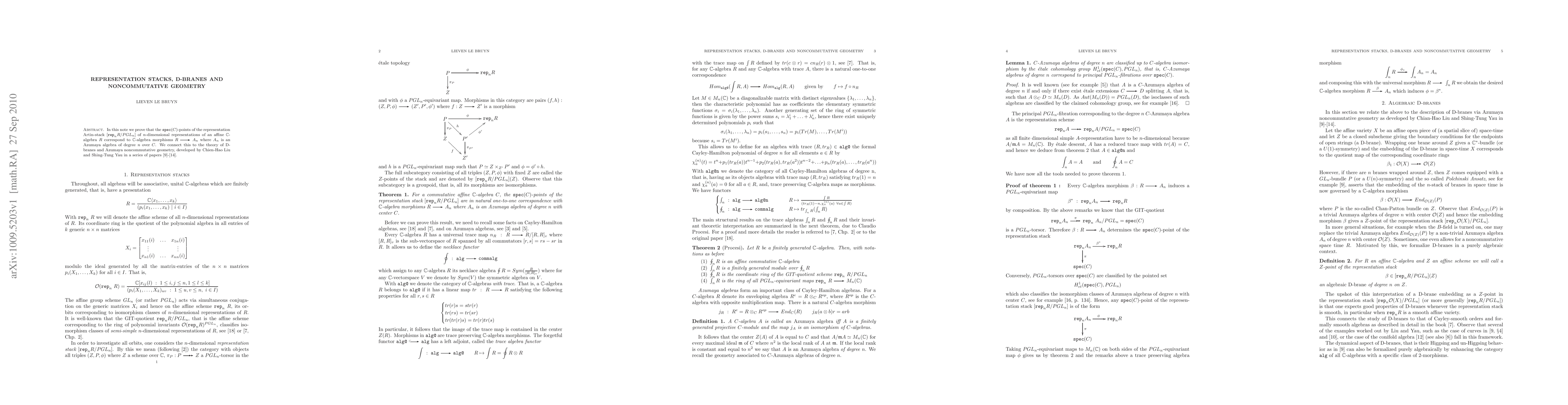 In this note we prove that the spec(C)-points of the representation Artin-stack [rep_n R/PGL_n] of n-dimensional representations of an affine algebra R correspond to algebra morphisms R-->A where A is an Azumaya algebra of degree n over C. We connect this to the study of D-branes and Azumaya noncommutative geometry, developed by Chien-Hao Liu and Shing-Tung Yau in a series of papers from arXiv:0709.1515 to arXiv:1003.1178