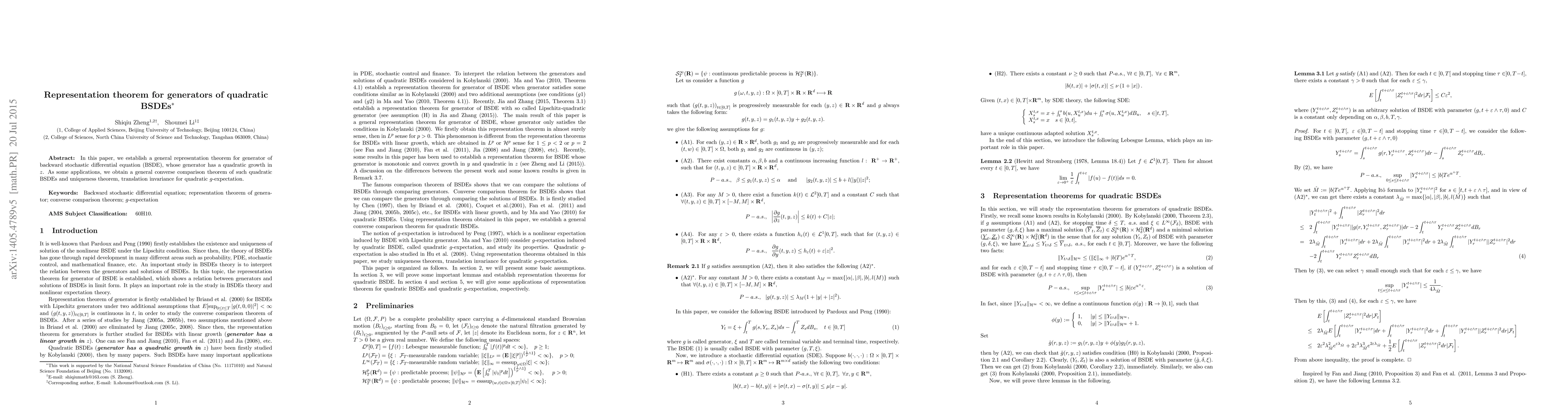 This paper establishes a representation theorem for generators of quadratic backward stochastic differential equations (BSDEs), providing implications for applications including converse comparison theorems and uniqueness theorems.