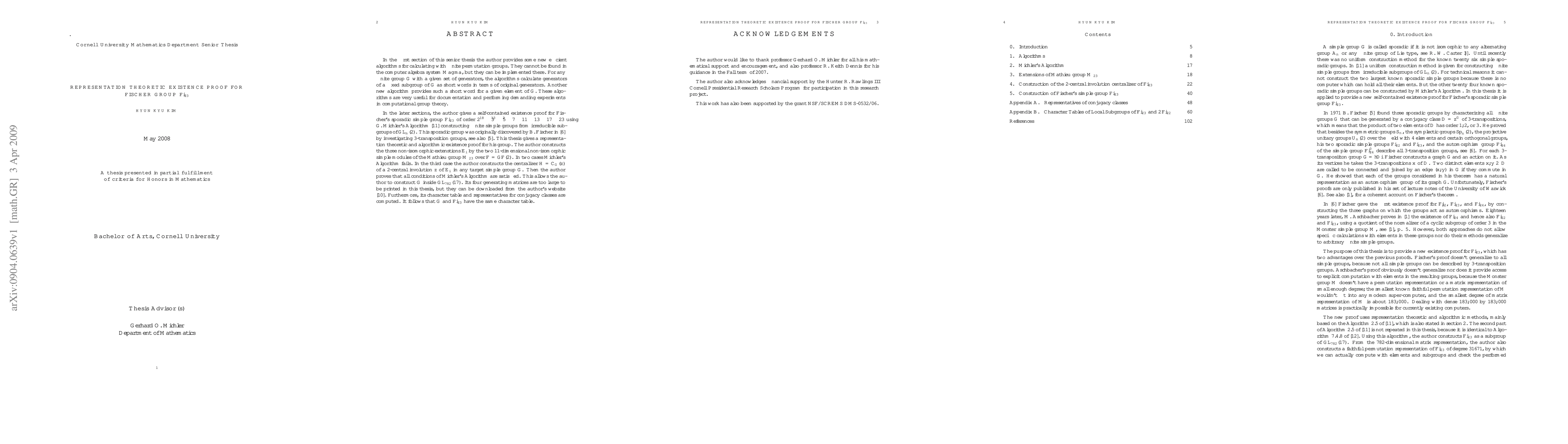 In the first section of this senior thesis the author provides some new efficient algorithms for calculating with finite permutation groups. They cannot be found in the computer algebra system MAGMA, but they can be implemented there. For any finite group G with a given set of generators, the algorithms calculate generators of a fixed subgroup of G as short words in terms of original generators. Another new algorithm provides such a short word for a given element of G. In the later sections, the author gives a self-contained existence proof for Fischer's sporadic simple group Fi_{23} using G. Michler's Algorithm [11] constructing finite simple groups from irreducible subgroups of GL_n(2). This sporadic group was originally discovered by B. Fischer in [6] by investigating 3-transposition groups, see also [5]. This thesis gives a representation theoretic and algorithmic existence proof for his group. The author constructs the three non-isomorphic extenstions E_i by the two 11-dimensional non-isomorphic simple modules of the Mathieu group M_{23} over F=GF(2). In two cases Michler's Algorithm fails. In the third case the author constructs the centralizer H=C_G(z) of a 2-central involution z of E_i in any target simple group G. This allows the author to construct G inside GL_{782}(17). Its four generating matrices, character table and representatives for conjugacy classes are computed. It follows that G and Fi_{23} have the same character table.