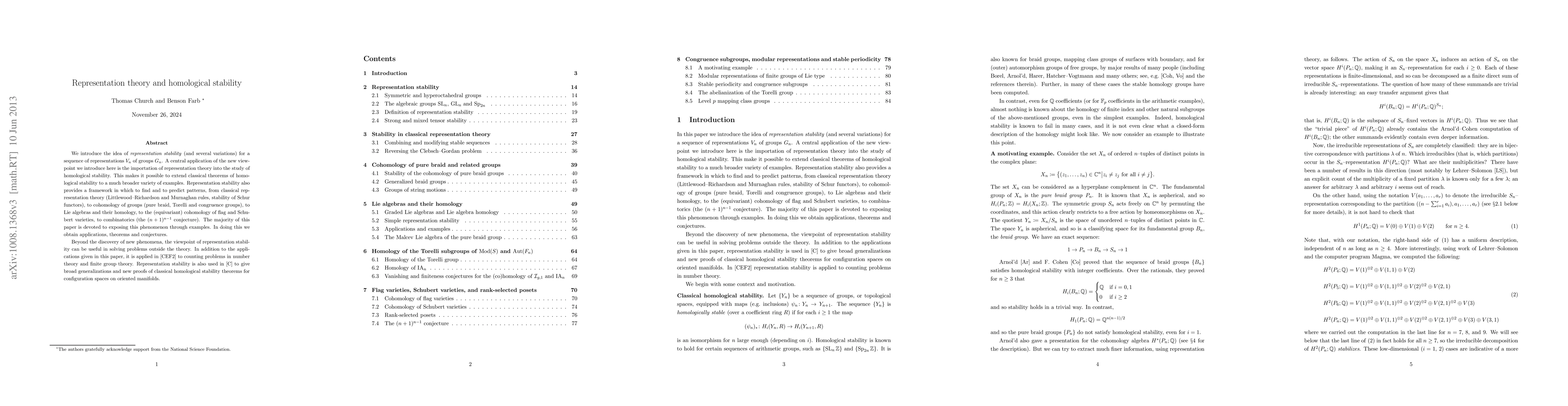 This paper introduces *representation stability* for sequences of group representations, extending homological stability theorems to a wider range of examples. It demonstrates how representation stability offers a framework for identifying patterns across classical representation theory, group cohomology, Lie algebras, and combinatorics, with applications in number theory and finite group theory.