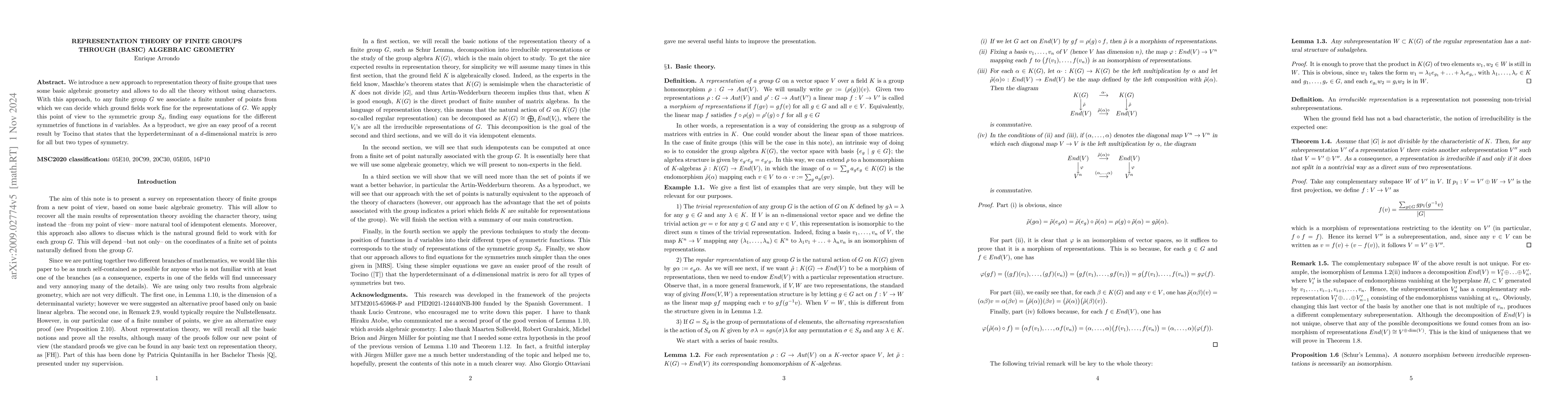 We introduce a new approach to representation theory of finite groups that uses some basic algebraic geometry and allows to do all the theory without using characters. With this approach, to any finite group $G$ we associate a finite number of points and show that any field containing the coordinates of those points works fine as the ground field for the representations of $G$. We apply this point of view to the symmetric group $S_d$, finding easy equations for the different symmetries of functions in $d$ variables. As a byproduct, we give an easy proof of a recent result by Tocino that states that the hyperdeterminant of a $d$-dimensional matrix is zero for all but two types of symmetry.
