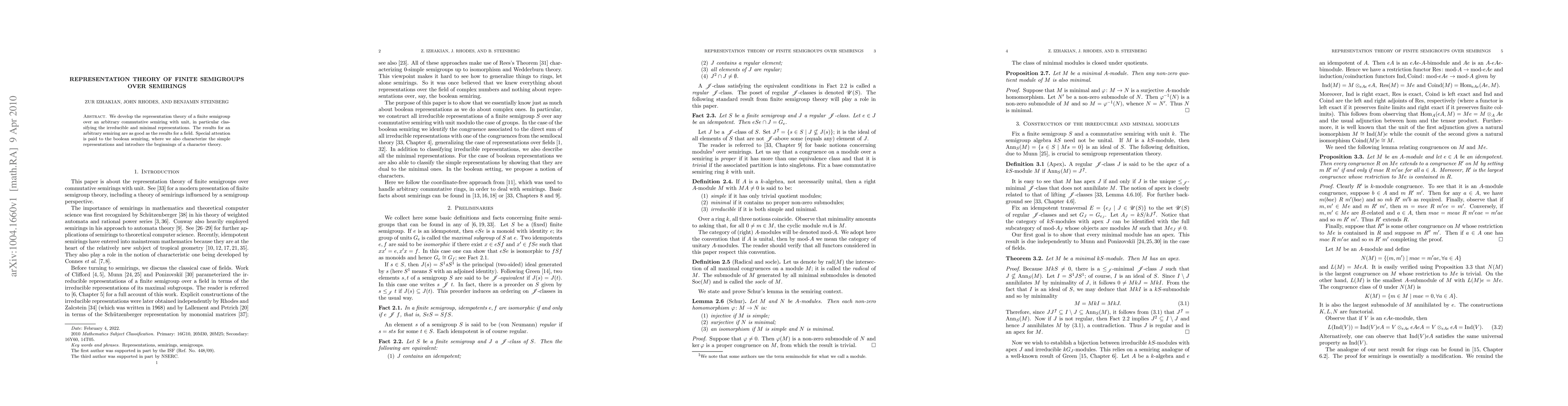We develop the representation theory of a finite semigroup over an arbitrary commutative semiring with unit, in particular classifying the irreducible and minimal representations. The results for an arbitrary semiring are as good as the results for a field. Special attention is paid to the boolean semiring, where we also characterize the simple representations and introduce the beginnings of a character theory.