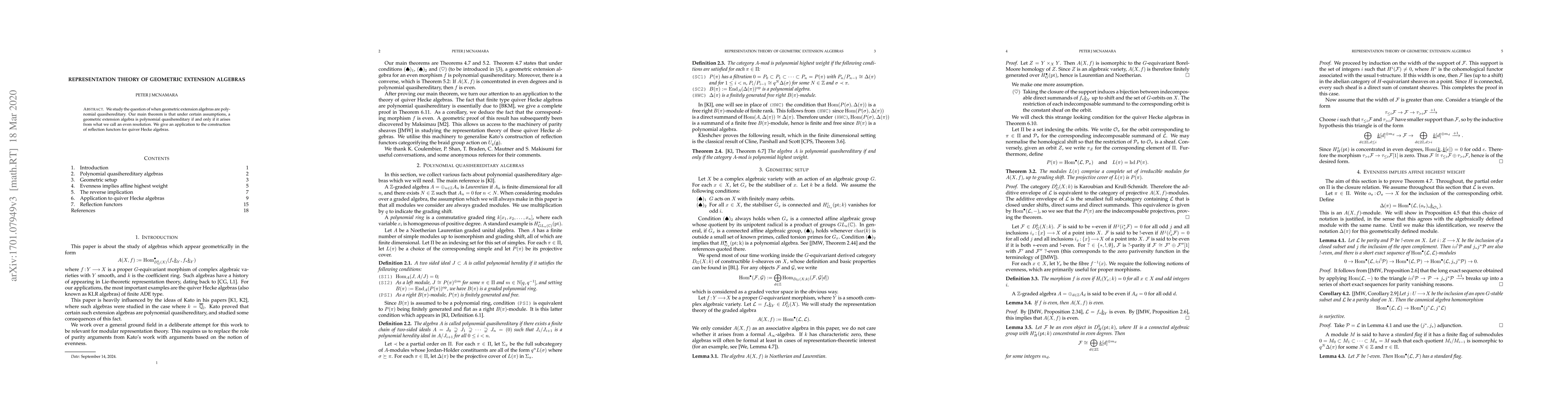 We study the question of when geometric extension algebras are polynomial quasihereditary. Our main theorem is that under certain assumptions, a geometric extension algebra is polynomial quasihereditary if and only if it arises from an even resolution. We give an application to the construction of reflection functors for quiver Hecke algebras.