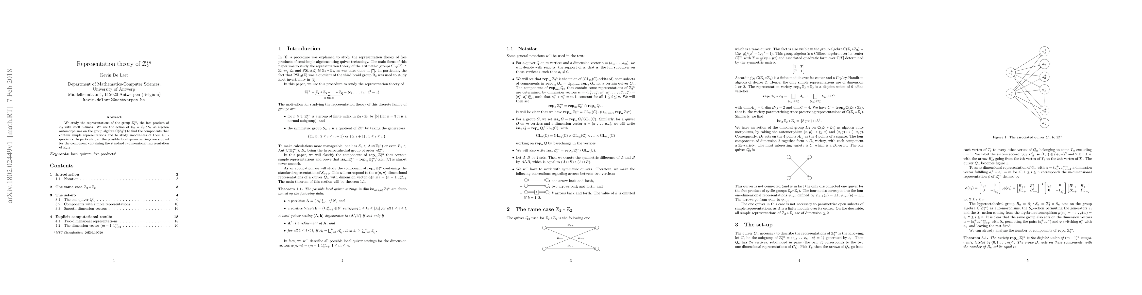 We study the representations of the group $\mathbb{Z}_2^{*n}$, the free product of $\mathbb{Z}_2$ with itself $n$-times. We use the action of $B_n = S_2 \wr S_n $ as algebra automorphisms on the group algebra $\mathbb{C}(\mathbb{Z}_2^{*n})$ to find the components that contain simple representations and to study smoothness of their GIT-quotients. In particular, all the possible local quiver settings are studied for the component containing the standard $n$-dimensional representation of $S_{n+1}$.