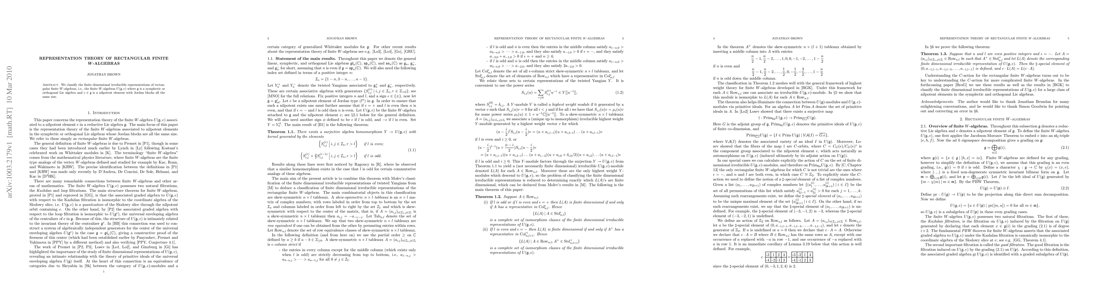 We classify the finite dimensional irreducible representations of rectangular finite $W$-algebras, i.e., the finite $W$-algebras $U(\mathfrak{g}, e)$ where $\mathfrak{g}$ is a symplectic or orthogonal Lie algebra and $e \in \mathfrak{g}$ is a nilpotent element with Jordan blocks all the same size.