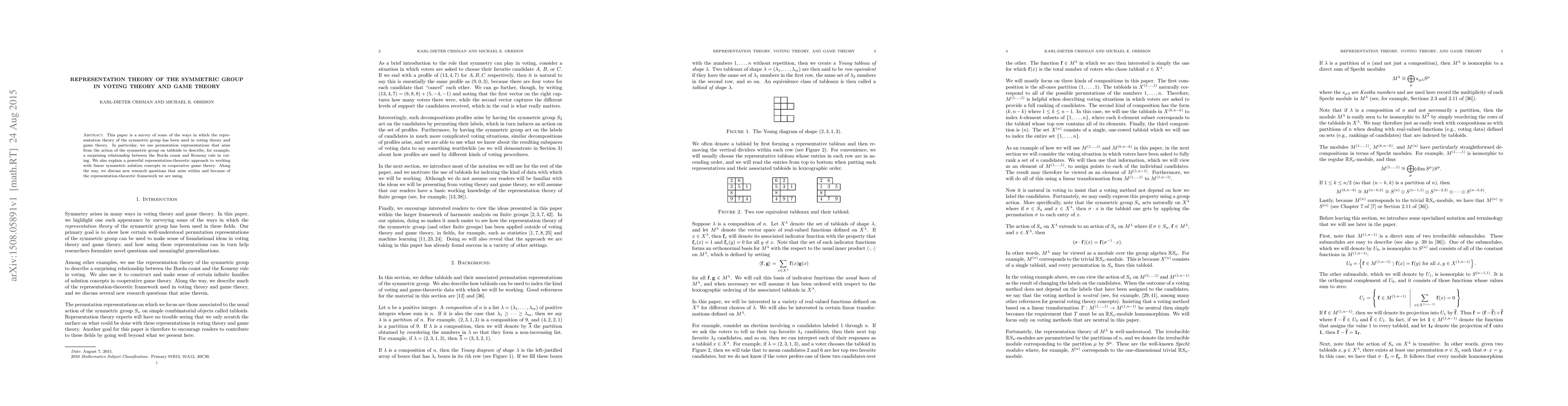 This paper surveys the application of symmetric group representation theory in voting and game theory, highlighting its use in explaining relationships between voting methods and cooperative game solutions, and introducing new research questions.