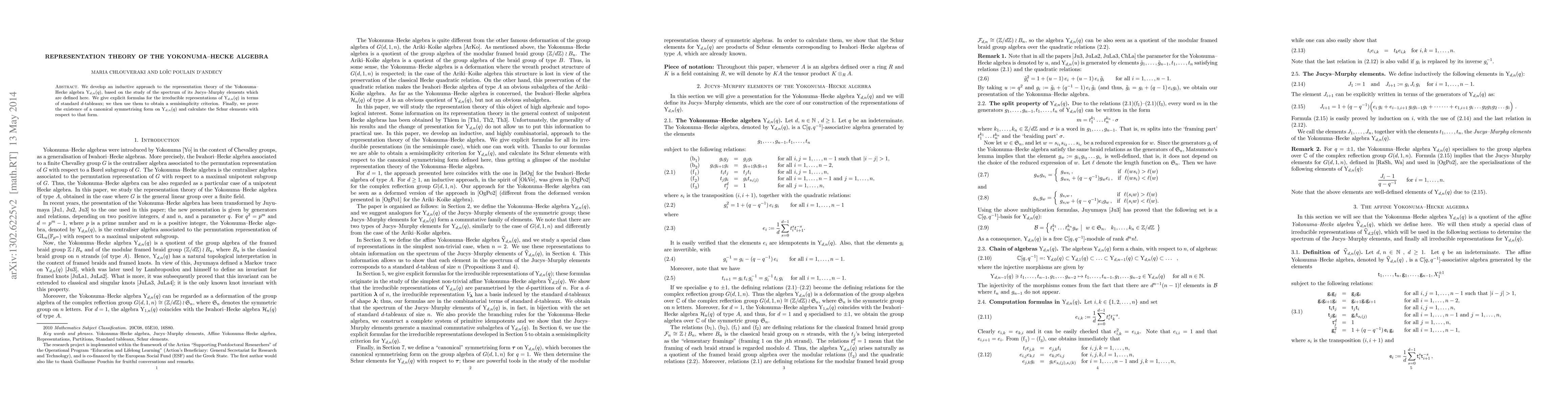 This paper presents an inductive method for understanding the representation theory of the Yokonuma-Hecke algebra, ${ m Y}_{d,n}(q)$. It introduces Jucys-Murphy elements and provides explicit formulas for irreducible representations using standard $d$-tableaux. The study also establishes a semisimplicity criterion and proves the existence of a symmetrising form, along with calculating Schur elements with respect to this form.
