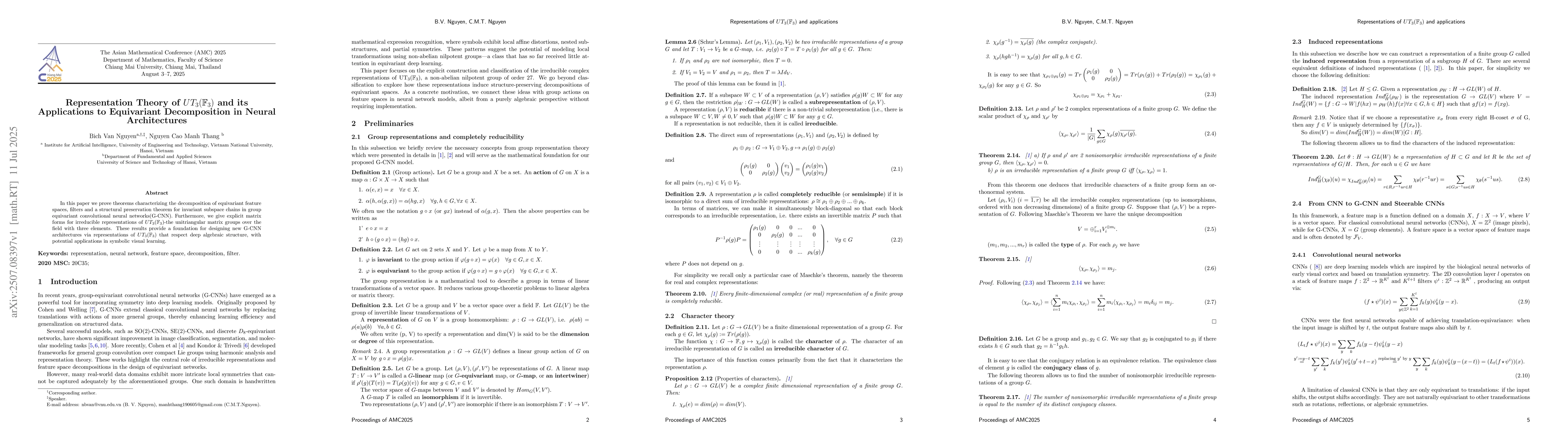 In this paper we prove theorems characterizing the decomposition of equivariant feature spaces, filters and a structural preservation theorem for invariant subspace chains in group equivariant convolutional neural networks(G-CNN). Furthermore, we give explicit matrix forms for irreducible representations of $UT_3(\F_3)$-the unitriangular matrix groups over the field with three elements. These results provide a foundation for designing new G-CNN architectures via representations of $UT_3(\F_3)$ that respect deep algebraic structure, with potential applications in symbolic visual learning.