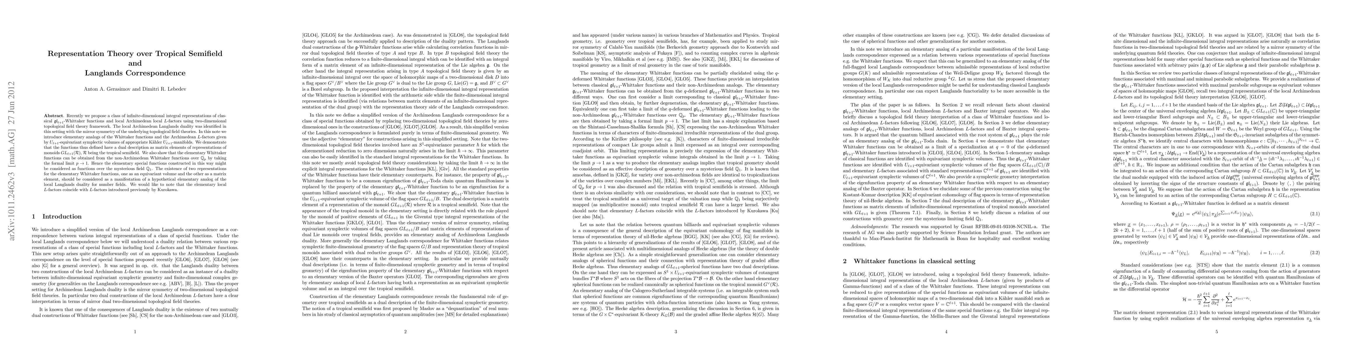 Recently we propose a class of infinite-dimensional integral representations of classical gl(n+1)-Whittaker functions and local Archimedean local L-factors using two-dimensional topological field theory framework. The local Archimedean Langlands duality was identified in this setting with the mirror symmetry of the underlying topological field theories. In this note we introduce elementary analogs of the Whittaker functions and the Archimedean L-factors given by U(n+1)-equivariant symplectic volumes of appropriate Kahler U(n+1)-manifolds. We demonstrate that the functions thus defined have a dual description as matrix elements of representations of monoids GL(n+1,R), R being the tropical semifield. We also show that the elementary Whittaker functions can be obtained from the non-Archimedean Whittaker functions over Q_p by taking the formal limit p->1. Hence the elementary special functions constructed in this way might be considered as functions over the mysterious field Q_1. The existence of two representations for the elementary Whittaker functions, one as an equivariant volume and the other as a matrix element, should be considered as a manifestation of a hypothetical elementary analog of the local Langlands duality for number fields. We would like to note that the elementary local L-factors coincide with L-factors introduced previously by Kurokawa.