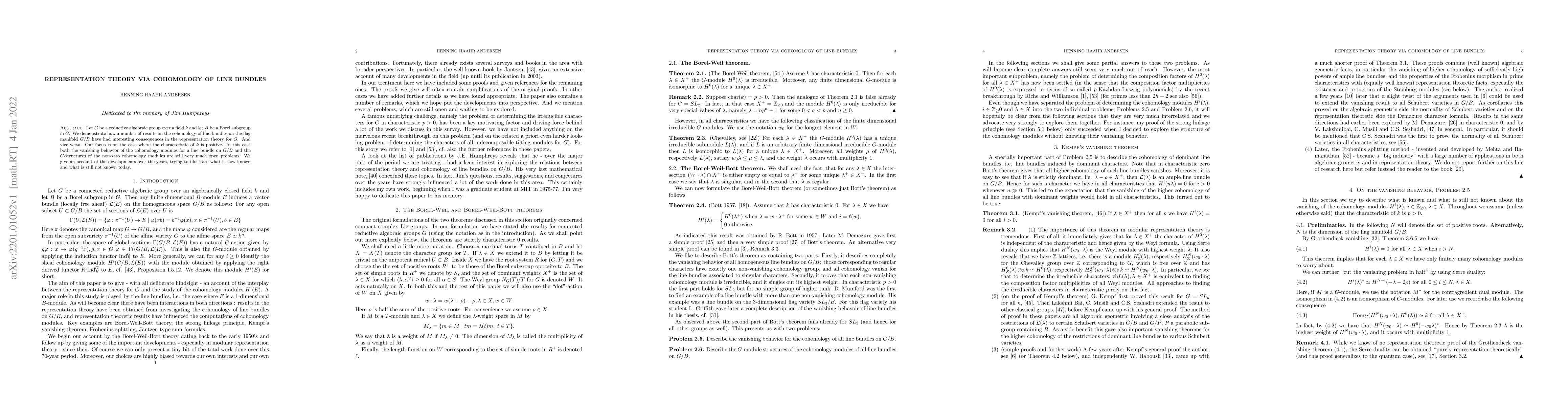 This paper explores the connection between cohomology of line bundles on flag manifolds G/B and representation theory of reductive algebraic groups G, particularly when the field's characteristic is positive. It summarizes known developments and open problems regarding the vanishing behavior and G-structures of cohomology modules.