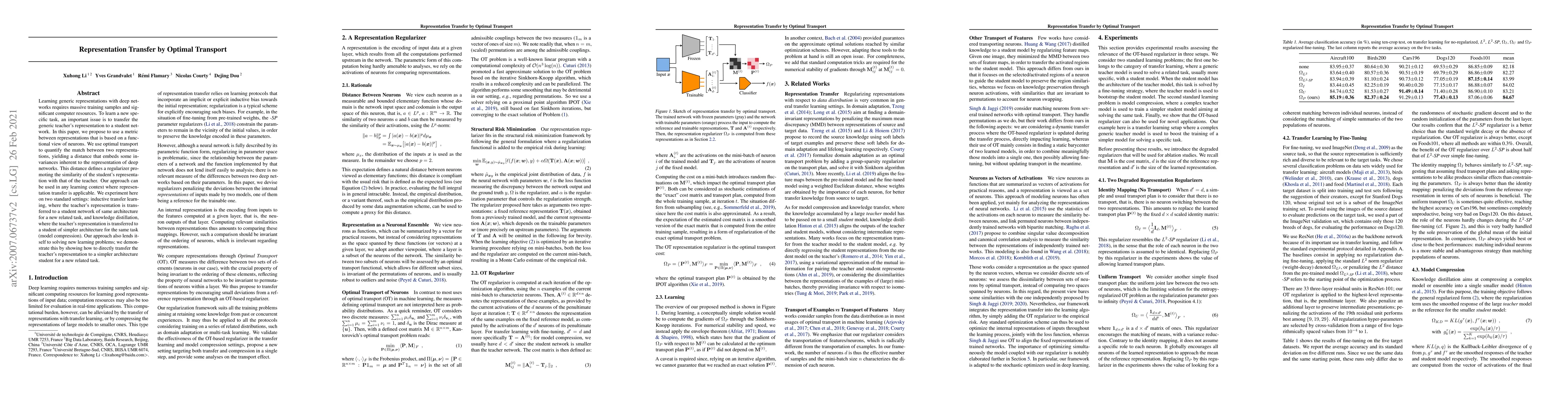 Learning generic representations with deep networks requires massive training samples and significant computer resources. To learn a new specific task, an important issue is to transfer the generic teacher's representation to a student network. In this paper, we propose to use a metric between representations that is based on a functional view of neurons. We use optimal transport to quantify the match between two representations, yielding a distance that embeds some invariances inherent to the representation of deep networks. This distance defines a regularizer promoting the similarity of the student's representation with that of the teacher. Our approach can be used in any learning context where representation transfer is applicable. We experiment here on two standard settings: inductive transfer learning, where the teacher's representation is transferred to a student network of same architecture for a new related task, and knowledge distillation, where the teacher's representation is transferred to a student of simpler architecture for the same task (model compression). Our approach also lends itself to solving new learning problems; we demonstrate this by showing how to directly transfer the teacher's representation to a simpler architecture student for a new related task.