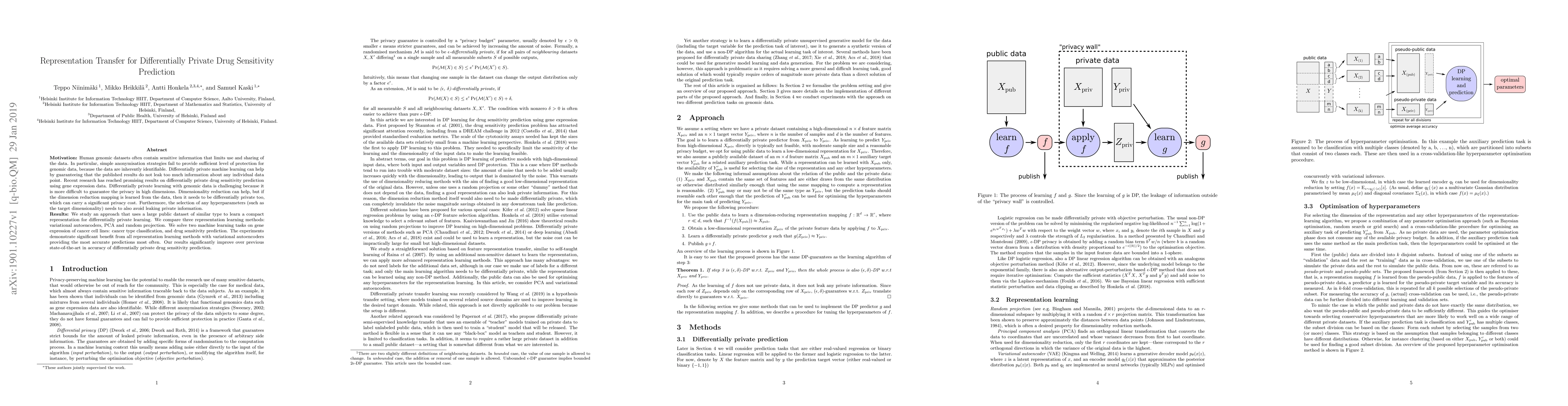 This paper explores differentially private machine learning for drug sensitivity prediction using gene expression data, addressing the challenge of privacy in high-dimensional genomic data. The study compares three representation learning methods—variational autoencoders, PCA, and random projection—and finds that variational autoencoders yield the most accurate predictions, significantly improving over previous state-of-the-art methods.