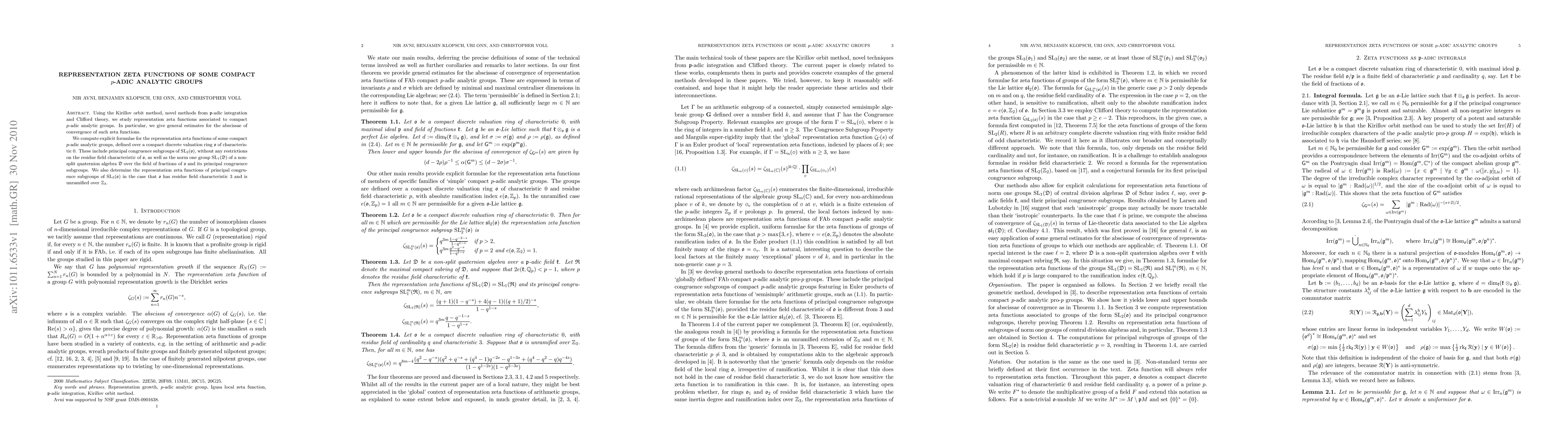 This paper explores representation zeta functions for certain compact p-adic analytic groups using the Kirillov orbit method, p-adic integration, and Clifford theory. It provides estimates for convergence abscissae and computes explicit formulas for groups including SL_2 and SL_3 principal congruence subgroups, especially in specific residue field characteristics.