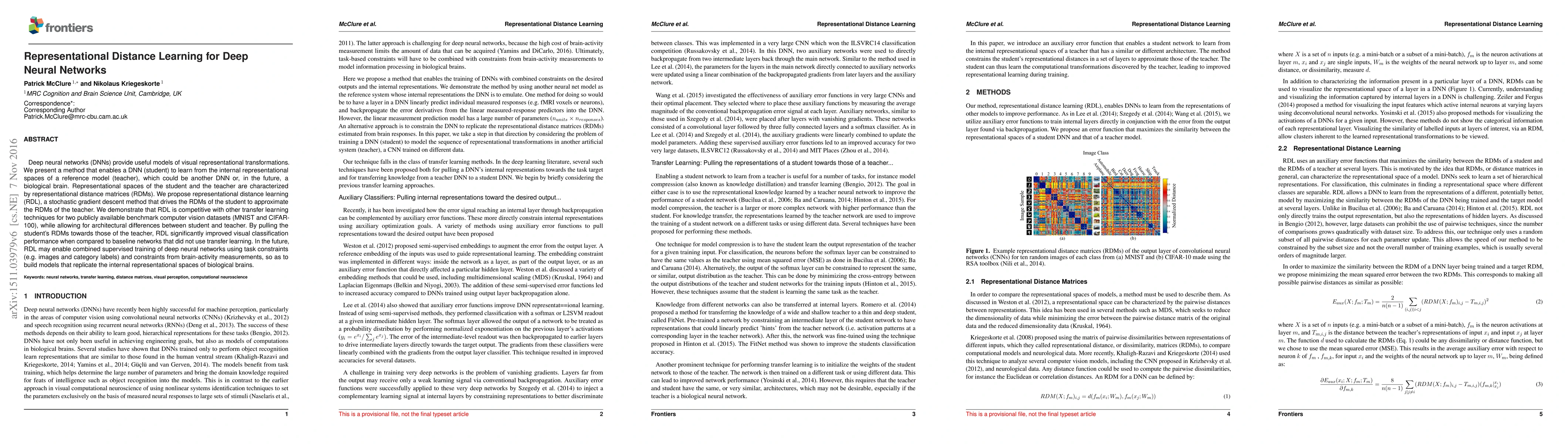 This paper introduces representational distance learning (RDL), a method that enables a deep neural network (student) to learn from the representational spaces of a reference model (teacher) by minimizing the difference between their representational distance matrices (RDMs). RDL shows competitive performance on computer vision datasets and improves classification accuracy compared to baseline networks.