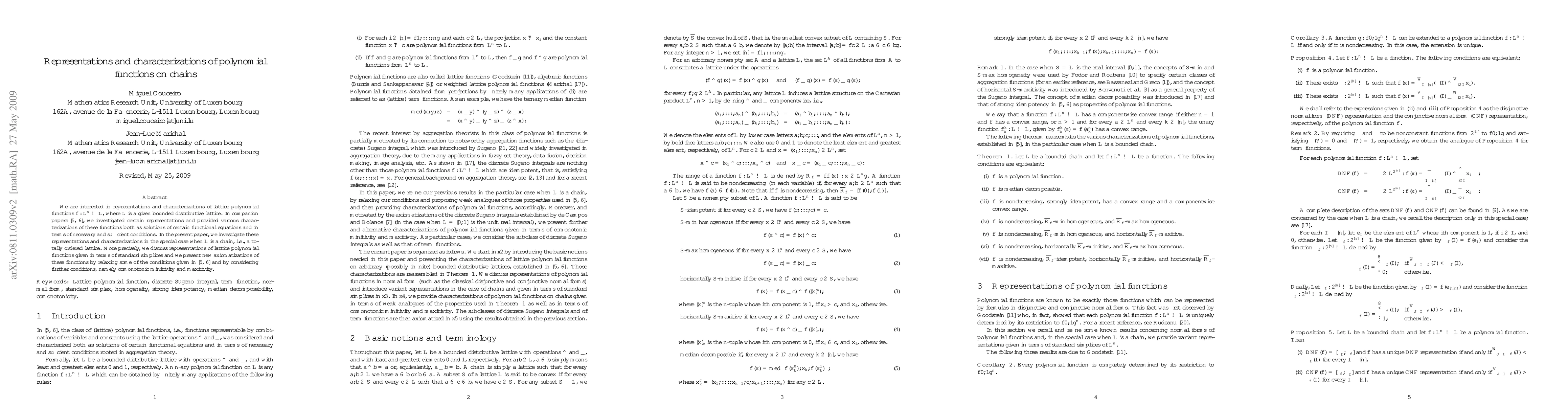 This paper explores representations and characterizations of lattice polynomial functions on chains, focusing on representations via standard simplices and new axiomatizations that relax previous conditions while introducing comonotonic minitivity and maxitivity.
