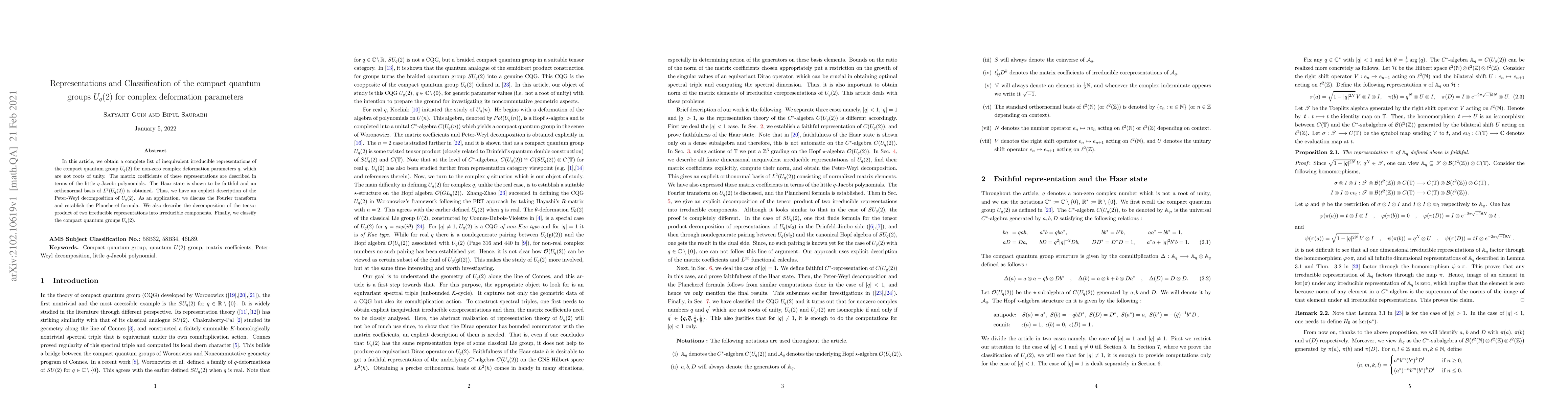 This paper provides a complete classification of irreducible representations of the compact quantum group $U_q(2)$ for complex deformation parameters $q$ that are not roots of unity, using little $q$-Jacobi polynomials. It establishes the faithfulness of the Haar state and derives an orthonormal basis for $L^2(U_q(2))$, leading to the explicit Peter-Weyl decomposition.