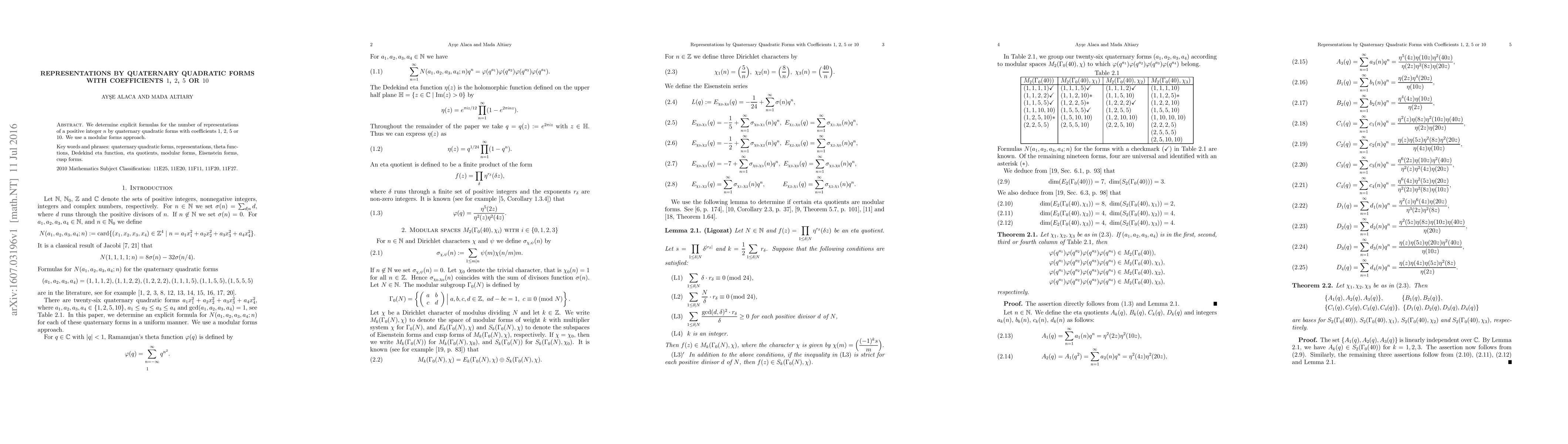 Summary: This paper provides explicit formulas for the representation of positive integers by specific quaternary quadratic forms using coefficients of $1$, $2$, $5$, or $10$, employing a modular forms methodology. The study focuses on deriving exact counts for these representations.