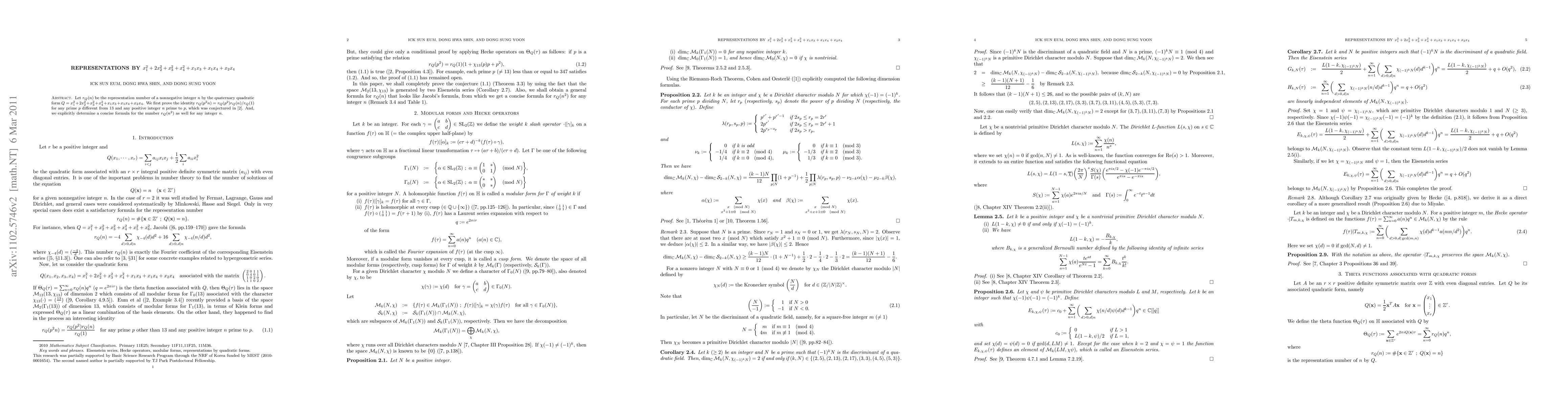Let $r_Q(n)$ be the representation number of a nonnegative integer $n$ by the quaternary quadratic form $Q=x_1^2+2x_2^2+x_3^2+x_4^2+x_1x_3+x_1x_4+x_2x_4$. We first prove the identity $r_Q(p^2n)=r_Q(p^2)r_Q(n)/r_Q(1)$ for any prime $p$ different from 13 and any positive integer $n$ prime to $p$, which was conjectured in [Eum et al, A modularity criterion for Klein forms, with an application to modular forms of level 13, J. Math. Anal. Appl. 375 (2011), 28--41]. And, we explicitly determine a concise formula for the number $r_Q(n^2)$ as well for any integer $n$.