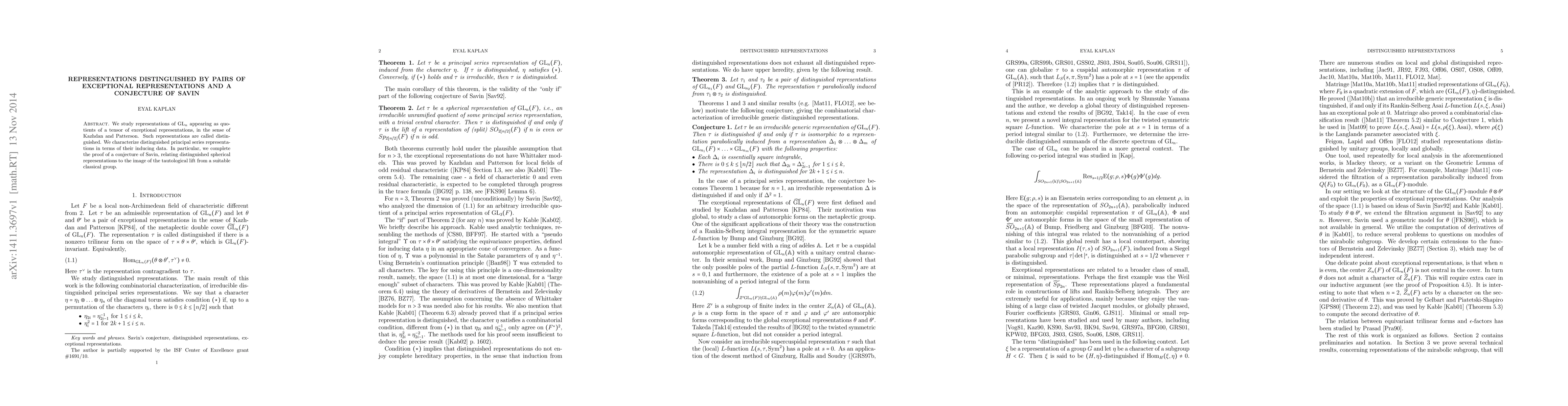 This paper investigates representations of GL(n) formed from tensors of exceptional representations, termed distinguished. It characterizes these representations and completes the proof of Savin's conjecture linking distinguished spherical representations to the image of a lift from a classical group.
