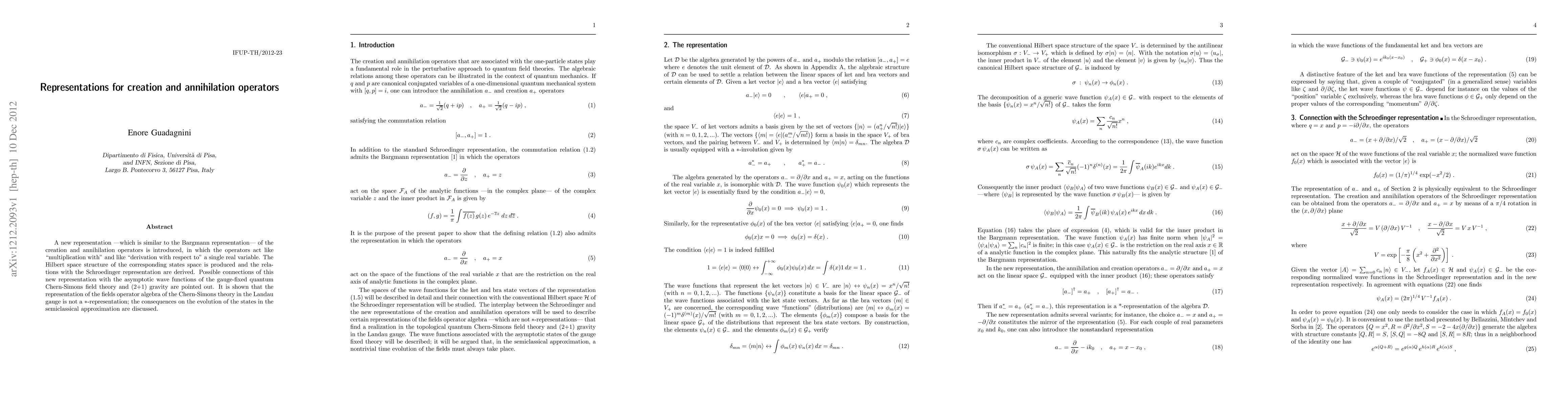 A new representation -which is similar to the Bargmann representation- of the creation and annihilation operators is introduced, in which the operators act like "multiplication with" and like "derivation with respect to" a single real variable. The Hilbert space structure of the corresponding states space is produced and the relations with the Schroedinger representation are derived. Possible connections of this new representation with the asymptotic wave functions of the gauge-fixed quantum Chern-Simons field theory and (2+1) gravity are pointed out. It is shown that the representation of the fields operator algebra of the Chern-Simons theory in the Landau gauge is not a *-representation; the consequences on the evolution of the states in the semiclassical approximation are discussed.
