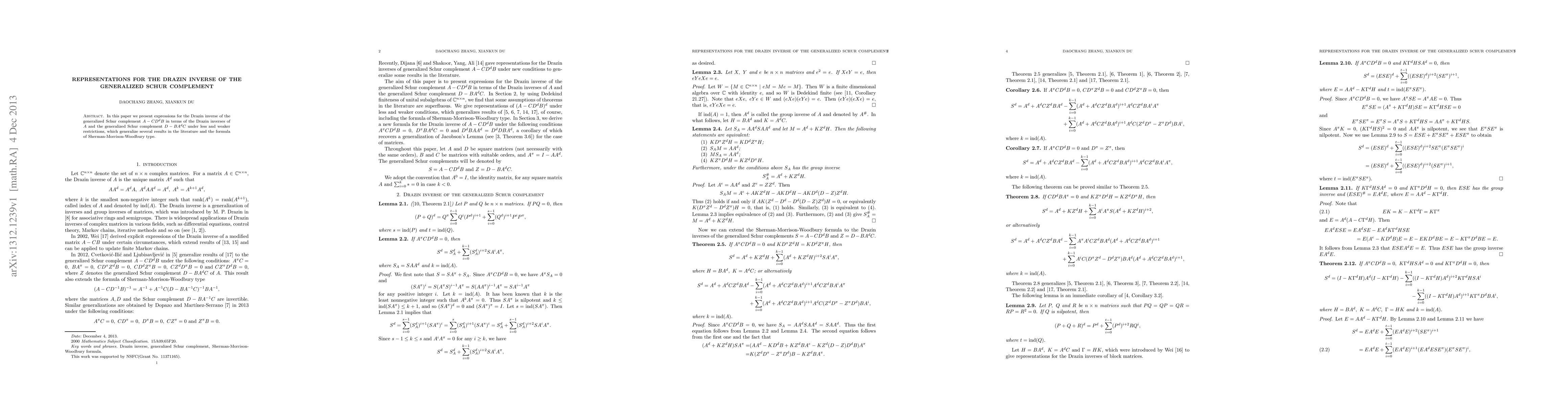 This research provides new formulas for the Drazin inverse of the generalized Schur complement, utilizing the Drazin inverses of sub-matrices A and another generalized Schur complement. These expressions are derived under fewer restrictions, broadening previous literature and extending the Sherman-Morrison-Woodbury type formula.