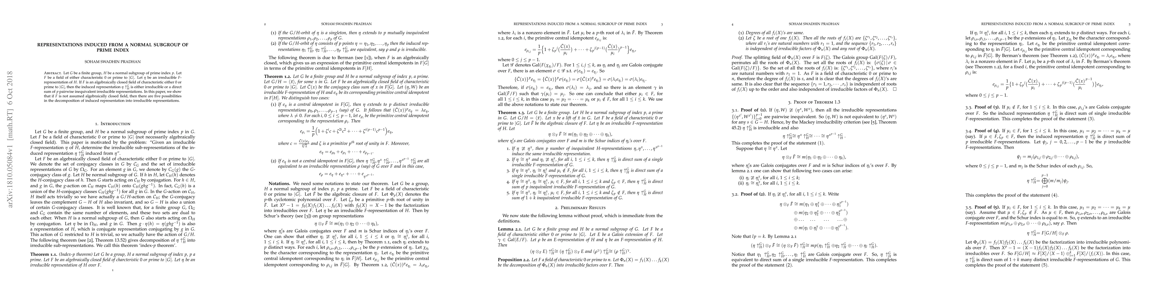 Let $G$ be a finite group, $H$ be a normal subgroup of prime index $p$. Let $F$ be a field of either characteristic $0$ or prime to $|G|$. Let $\eta$ be an irreducible $F$-representation of $H$. If $F$ is an algebraically closed field of characteristic either $0$ or prime to $|G|$, then the induced representation $\eta \uparrow^{G}_{H}$ is either irreducible or a direct sum of $p$ pairwise inequivalent irreducible representations. In this paper, we show that if $F$ is not assumed algebraically closed field, then there are five possibilities in the decomposition of induced representation into irreducible representations.