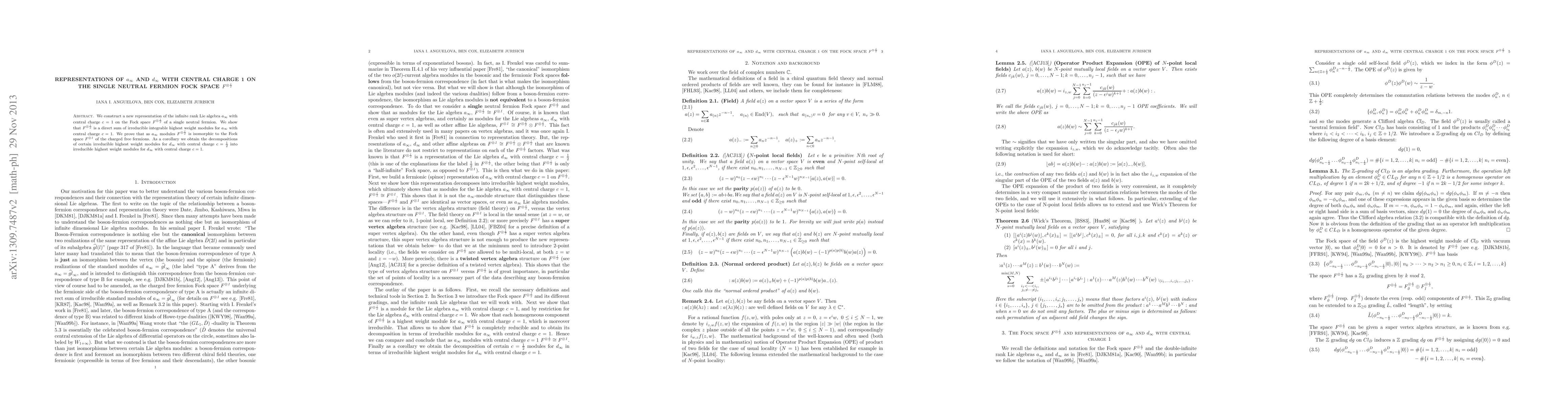 This paper constructs a new representation of the Lie algebra $a_{\infty}$ with central charge 1 on the single neutral fermion Fock space $\mathit{F^{\otimes \frac{1}{2}}}$, proving it is isomorphic to the Fock space $\mathit{F^{\otimes 1}}$ of charged fermions. It also decomposes certain irreducible highest weight modules for $d_{\infty}$ with central charge $\frac{1}{2}$ into modules for $d_{\infty}$ with central charge 1.