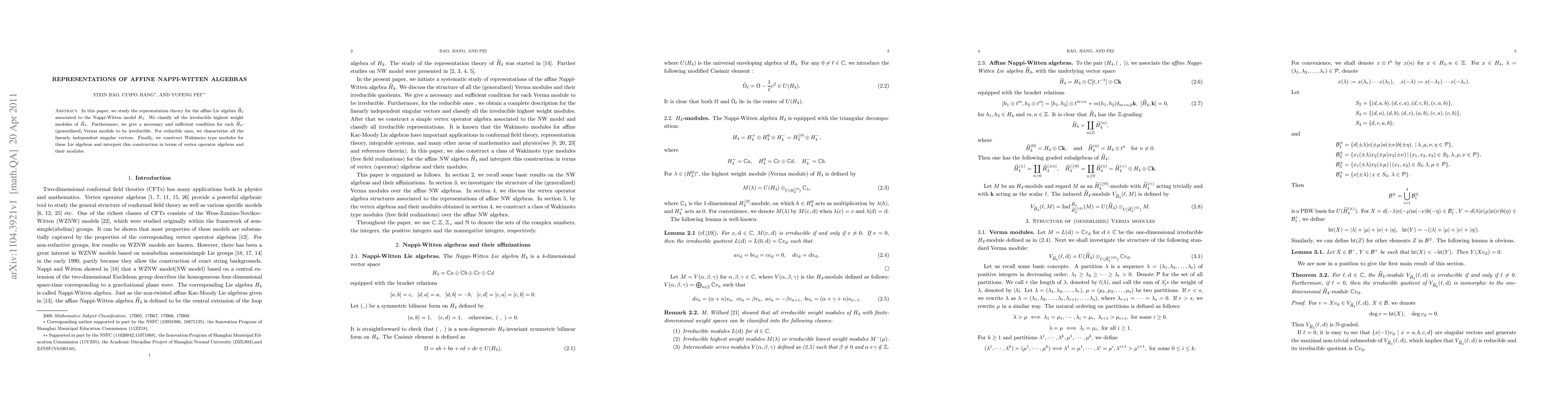 In this paper, we study the representation theory for the affine Lie algebra $\H$ associated to the Nappi-Witten model $H_{4}$. We classify all the irreducible highest weight modules of $\H$. Furthermore, we give a necessary and sufficient condition for each $\H$-(generalized) Verma module to be irreducible. For reducible ones, we characterize all the linearly independent singular vectors. Finally, we construct Wakimoto type modules for these Lie algebras and interpret this construction in terms of vertex operator algebras and their modules.