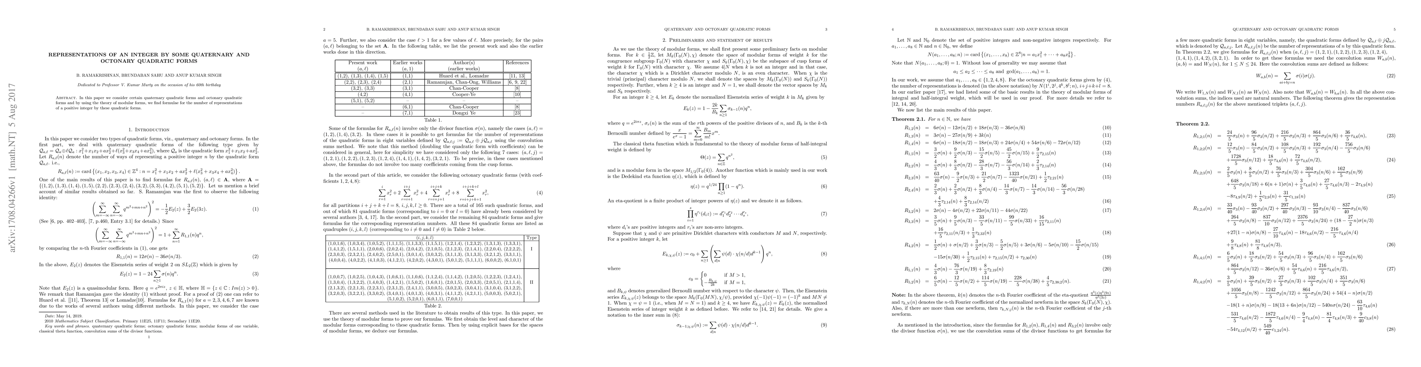 This paper utilizes modular forms theory to derive expressions for the number of ways a positive integer can be represented by specific quaternary and octonary quadratic forms. The findings provide mathematical formulae for these representations.