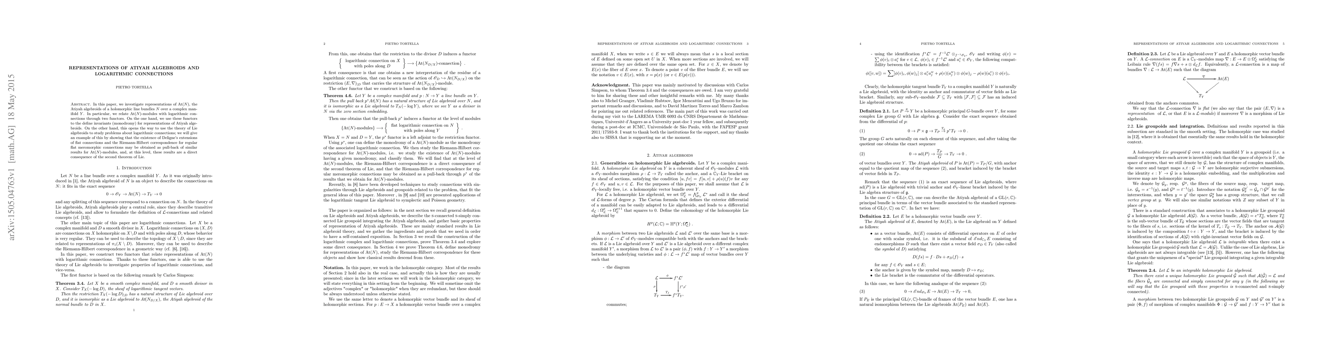 This paper investigates representations of Atiyah algebroids associated with holomorphic line bundles over complex manifolds, establishing a connection between $\operatorname{At}(N)$-modules and logarithmic connections via two functors. It introduces invariants (monodromy) for these representations and uses Lie algebroid theory to study logarithmic connections, illustrating this with the pull-back of Deligne's extensions and the Riemann-Hilbert correspondence.