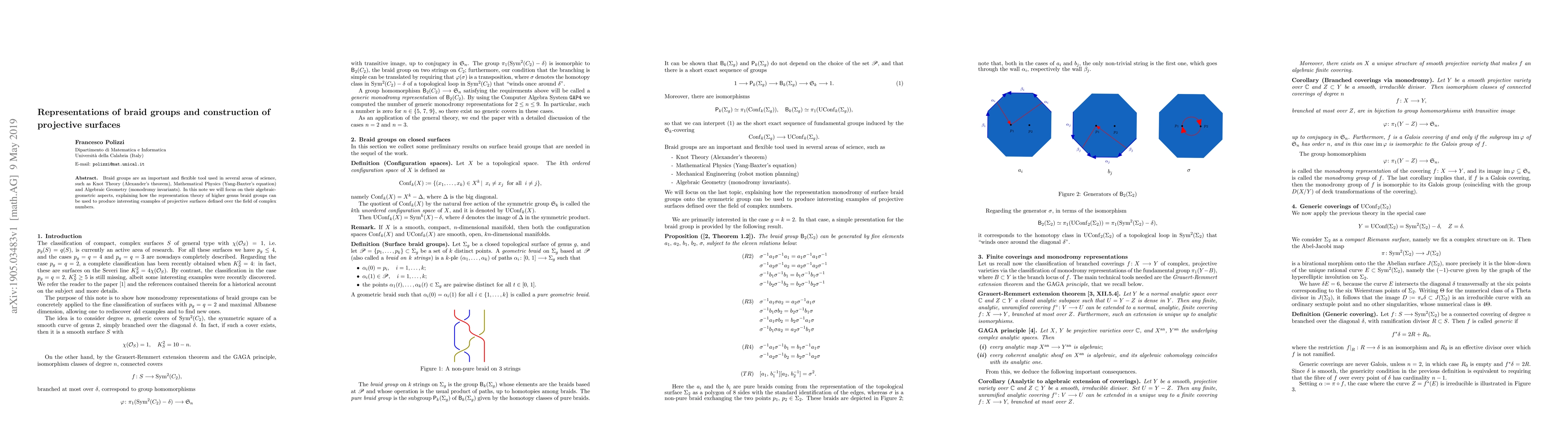 This paper explores the representation theory of higher genus braid groups and demonstrates its application in constructing projective surfaces over the complex numbers, linking algebraic geometry with braid group theory.