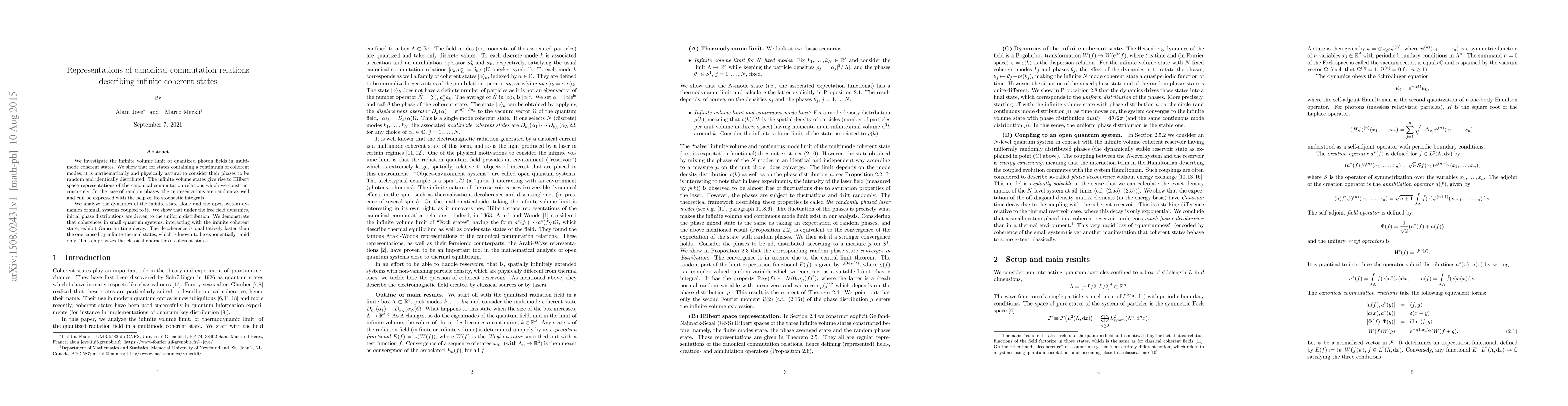 We investigate the infinite volume limit of quantized photon fields in multimode coherent states. We show that for states containing a continuum of coherent modes, it is mathematically and physically natural to consider their phases to be random and identically distributed. The infinite volume states give rise to Hilbert space representations of the canonical commutation relations which we construct concretely. In the case of random phases, the representations are random as well and can be expressed with the help of It\^o stochastic integrals. We analyze the dynamics of the infinite state alone and the open system dynamics of small systems coupled to it. We show that under the free field dynamics, initial phase distributions are driven to the uniform distribution. We demonstrate that coherences in small quantum systems, interacting with the infinite coherent state, exhibit Gaussian time decay. The decoherence is qualitatively faster than the one caused by infinite thermal states, which is known to be exponentially rapid only. This emphasizes the classical character of coherent states.