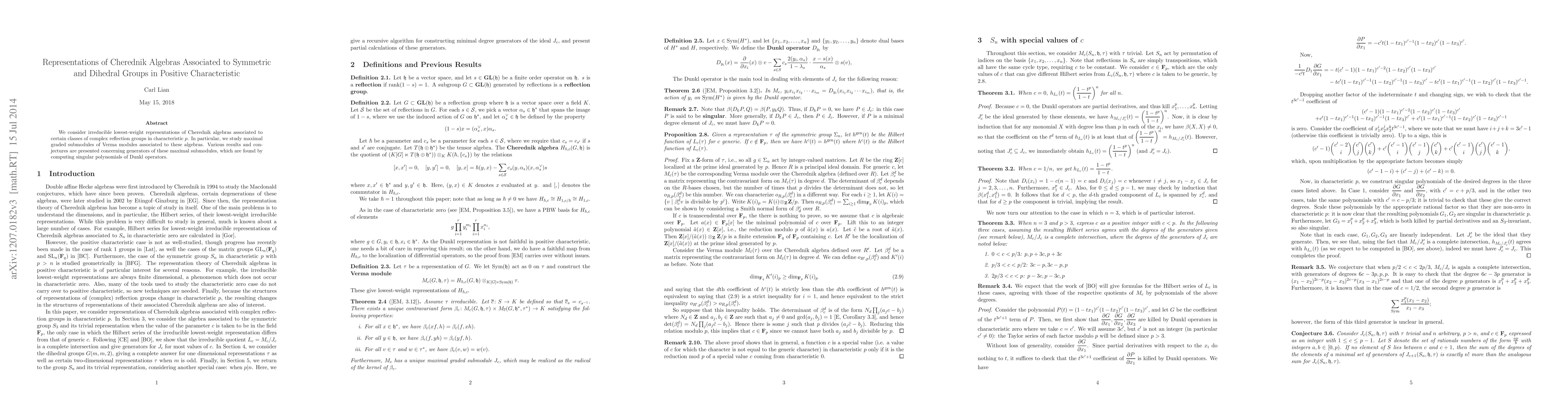 Summary: This paper investigates irreducible lowest-weight representations of Cherednik algebras linked to symmetric and dihedral groups in positive characteristic, focusing on maximal graded submodules of associated Verma modules and presenting results regarding the generators of these submodules derived from singular polynomials of Dunkl operators.