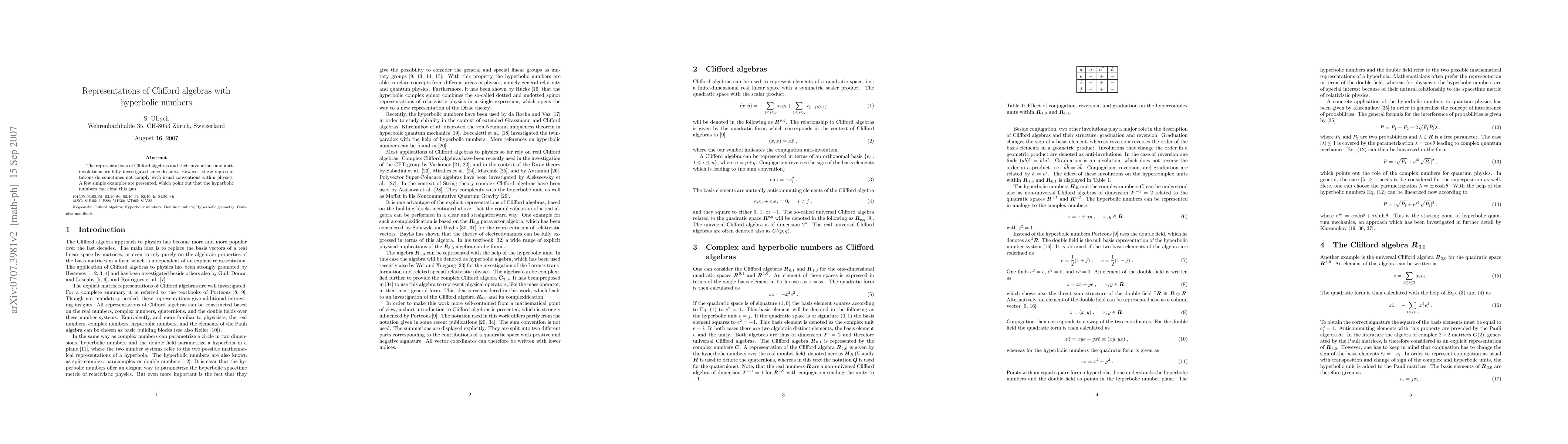 Summary: This paper investigates Clifford algebra representations, highlighting their involutions and anti-involutions, and proposes that hyperbolic numbers can bridge gaps in conventional physics applications. Simple examples illustrate the potential of hyperbolic numbers in this context.