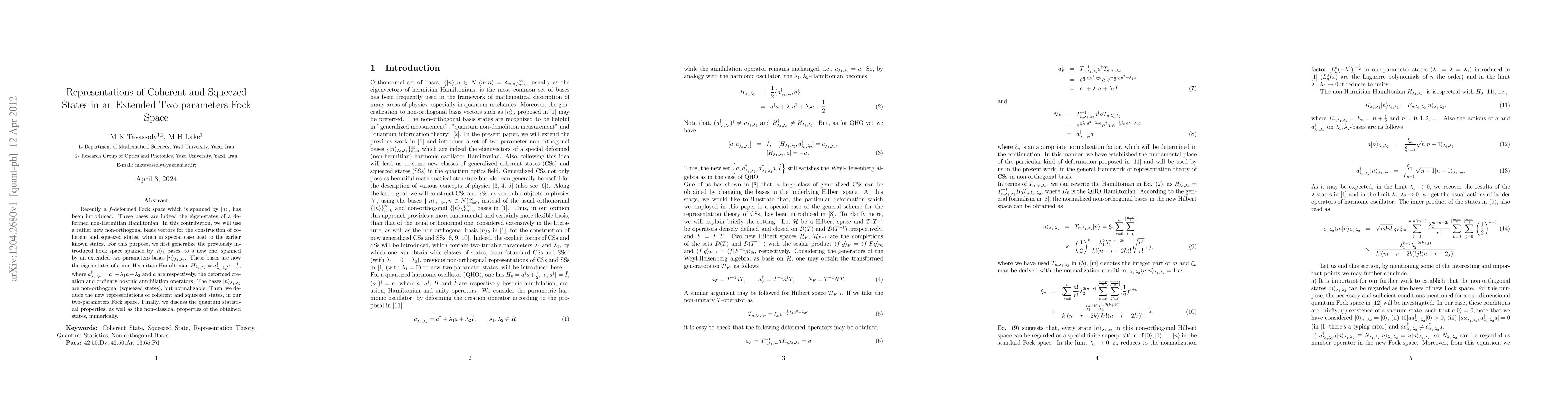Recently a $f$-deformed Fock space which is spanned by $|n>_{\lambda}$ has been introduced. These bases are indeed the eigen-states of a deformed non-Hermitian Hamiltonian. In this contribution, we will use a rather new non-orthogonal basis vectors for the construction of coherent and squeezed states, which in special case lead to the earlier known states. For this purpose, we first generalize the previously introduced Fock space spanned by $|n>_{\lambda}$ bases, to a new one, spanned by an extended two-parameters bases $|n>_{\lambda_{1},\lambda_{2}}$. These bases are now the eigen-states of a non-Hermitian Hamiltonian $H_{\lambda_{1},\lambda_{2}}=a^{\dagger}_{\lambda_{1},\lambda_{2}}a+1/2$, where $a^{\dagger}_{\lambda_{1},\lambda_{2}}=a^{\dagger}+\lambda_{1}a + \lambda_{2}$ and $a$ are respectively, the deformed creation and ordinary bosonic annihilation operators. The bases $|n>_{\lambda_{1},\lambda_{2}}$ are non-orthogonal (squeezed states), but normalizable. Then, we deduce the new representations of coherent and squeezed states, in our two-parameters Fock space. Finally, we discuss the quantum statistical properties, as well as the non-classical properties of the obtained states, numerically.