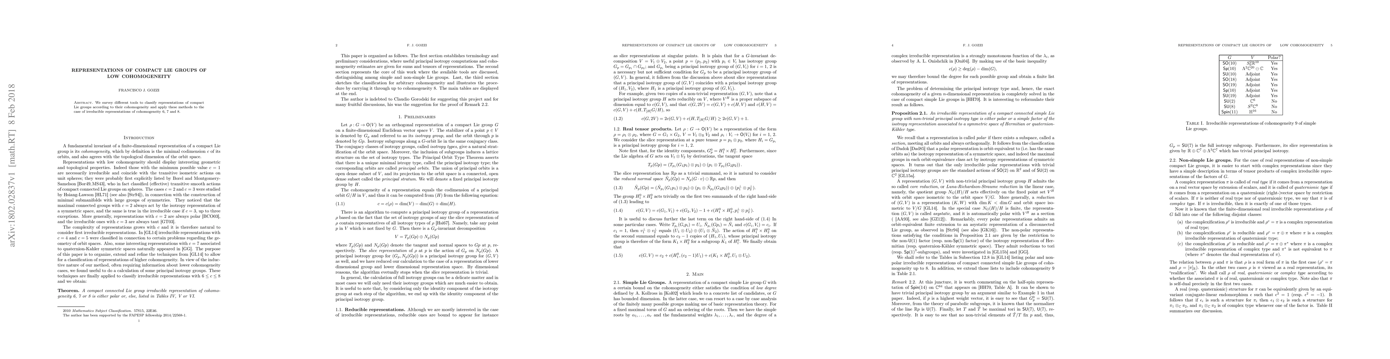 The paper presents a systematic approach to classifying irreducible representations of compact Lie groups using cohomogeneity, incorporating real forms and tensor product analysis.