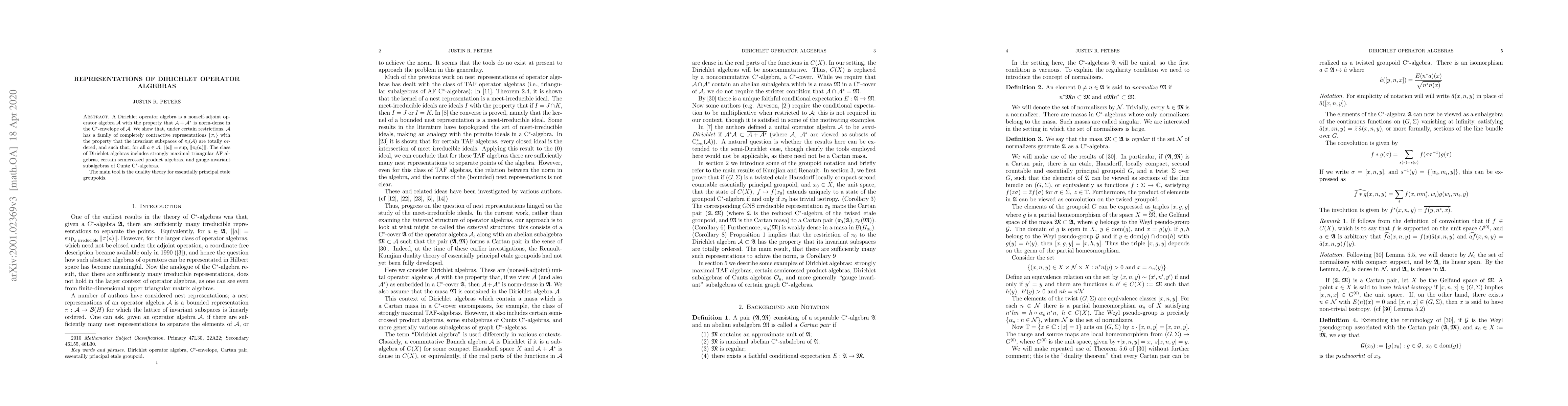 A Dirichlet operator algebra is a nonself-adjoint operator algebra $\mathcal{A}$ with the property that $\mathcal{A} + \mathcal{A}^*$ is norm-dense in the C$^*$-envelope of $\mathcal{A}.$ We show that, under certain restrictions, $\mathcal{A}$ has a family of completely contractive representations $\{\pi_i\}$ with the property that the invariant subspaces of $\pi_i(\mathcal{A})$ are totally ordered, and such that, for all $a \in \mathcal{A}, \ ||a|| = \sup_i ||\pi_i(a)||.$ The class of Dirichlet algebras includes strongly maximal triangular AF algebras, certain semicrossed product algebras, and gauge-invariant subalgebras of Cuntz C$^*$-algebras. The main tool is the duality theory for essentially principal etale groupoids.