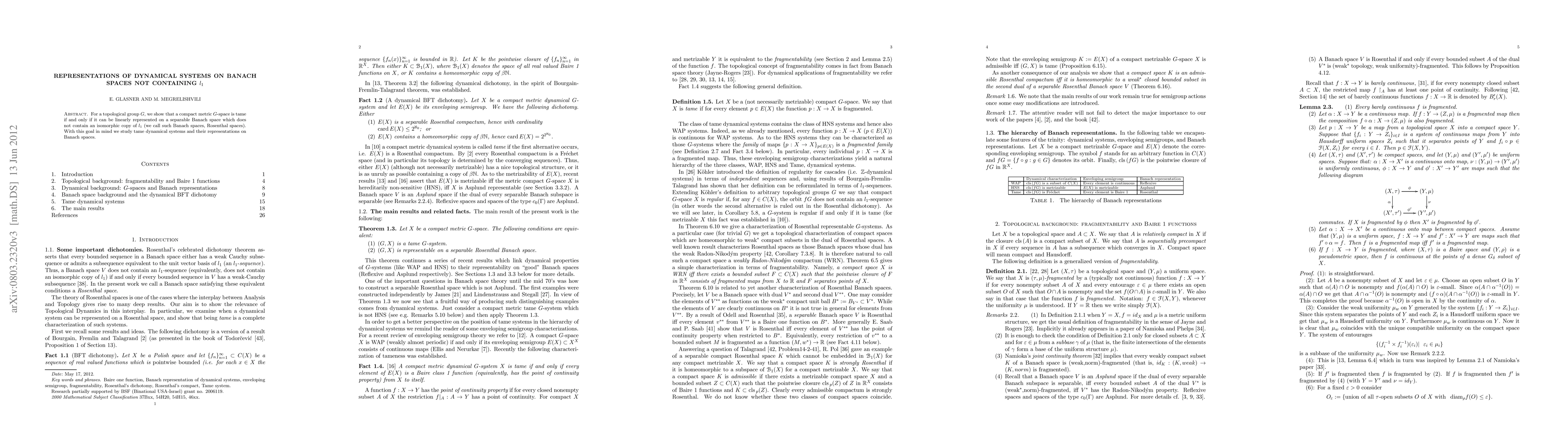 This paper demonstrates that a compact metric G-space is tame if and only if it can be represented on a separable Banach space that does not contain an isomorphic copy of $l_1$, termed a Rosenthal space. The study focuses on the representations of tame dynamical systems on such Banach spaces.