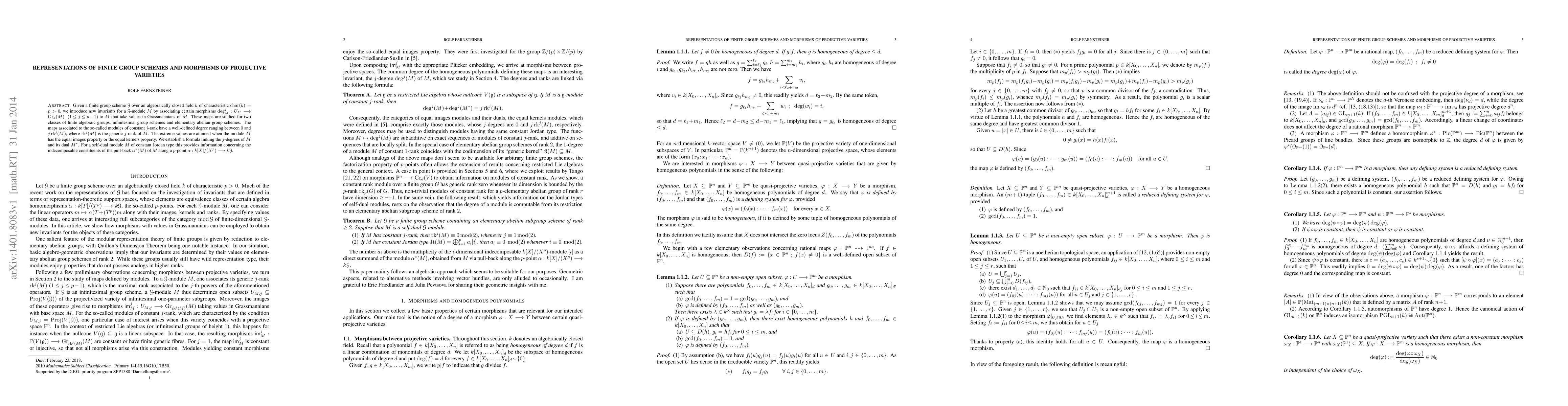 Given a finite group scheme $\cG$ over an algebraically closed field $k$ of characteristic $\Char(k)=p>0$, we introduce new invariants for a $\cG$-module $M$ by associating certain morphisms $\deg^j_M : U_M \lra \Gr_d(M) \ \ (1\!\le\!j\!\le\! p\!-\!1)$ to $M$ that take values in Grassmannians of $M$. These maps are studied for two classes of finite algebraic groups, infinitesimal group schemes and elementary abelian group schemes. The maps associated to the so-called modules of constant $j$-rank have a well-defined degree ranging between $0$ and $j\rk^j(M)$, where $\rk^j(M)$ is the generic $j$-rank of $M$. The extreme values are attained when the module $M$ has the equal images property or the equal kernels property. We establish a formula linking the $j$-degrees of $M$ and its dual $M^\ast$. For a self-dual module $M$ of constant Jordan type this provides information concerning the indecomposable constituents of the pull-back $\alpha^\ast(M)$ of $M$ along a $p$-point $\alpha : k[X]/(X^p) \lra k\cG$.