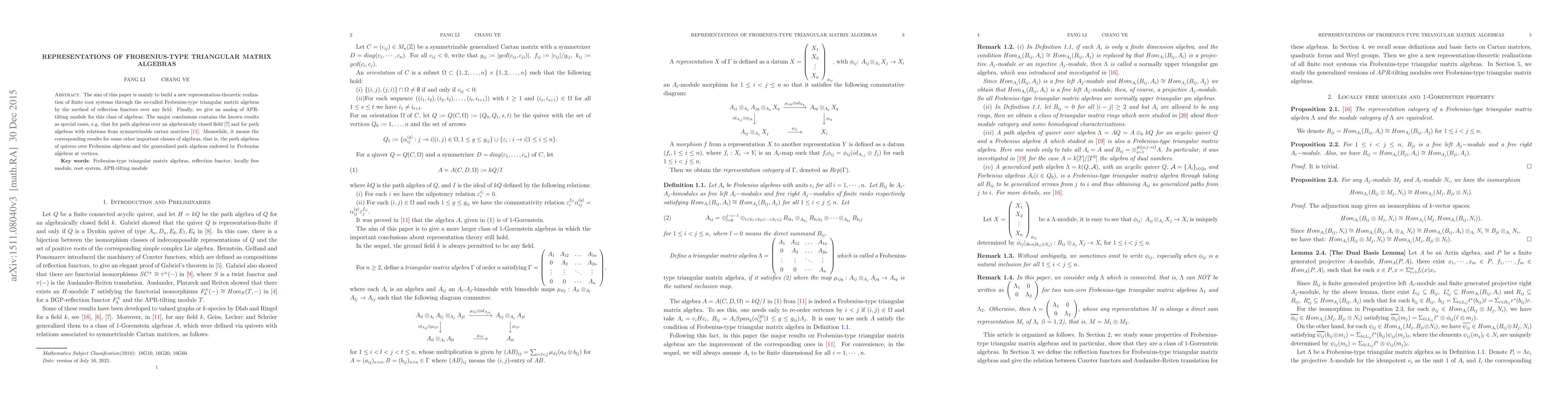 This paper constructs a new representation-theoretic framework for finite root systems using Frobenius-type triangular matrix algebras via reflection functors. The study also introduces an analog of APR-tilting modules for these algebras, encompassing known results for path algebras and extending to path algebras with Frobenius algebras at vertices.