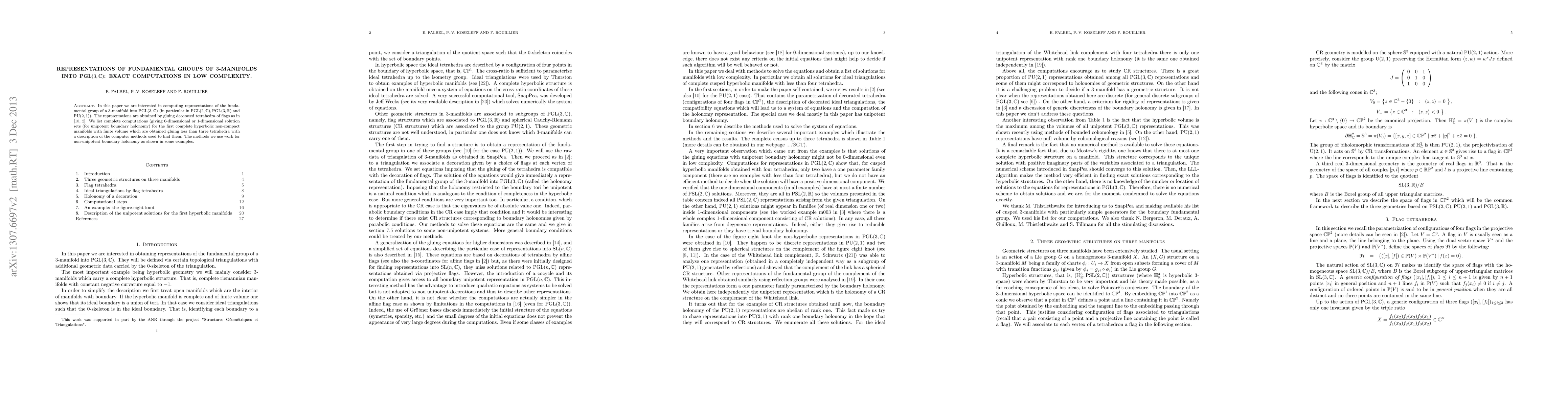 In this paper we are interested in computing representations of the fundamental group of a 3-manifold into PSL(3;C) (in particular in PSL(2;C); PSL(3;R) and PU(2; 1)). The representations are obtained by gluing decorated tetrahedra of flags. We list complete computations (giving 0-dimensional or 1-dimensional solution sets) for the first complete hyperbolic non-compact manifolds with finite volume which are obtained gluing less than three tetrahedra with a description of the computer methods used to find them.