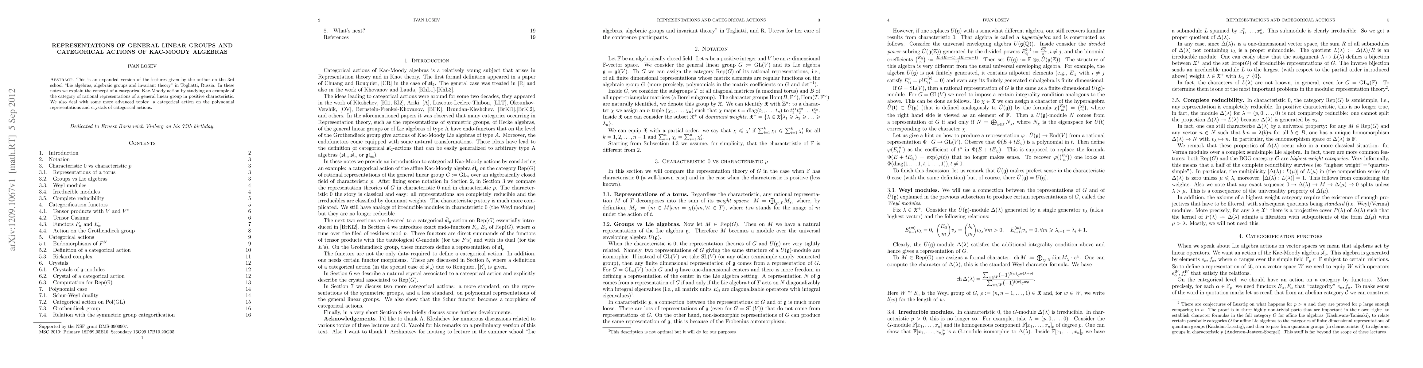 This paper elaborates on the concept of categorical Kac-Moody algebra actions, using rational representations of general linear groups in positive characteristic as an example. It also explores advanced topics such as actions on polynomial representations and crystals of categorical actions.