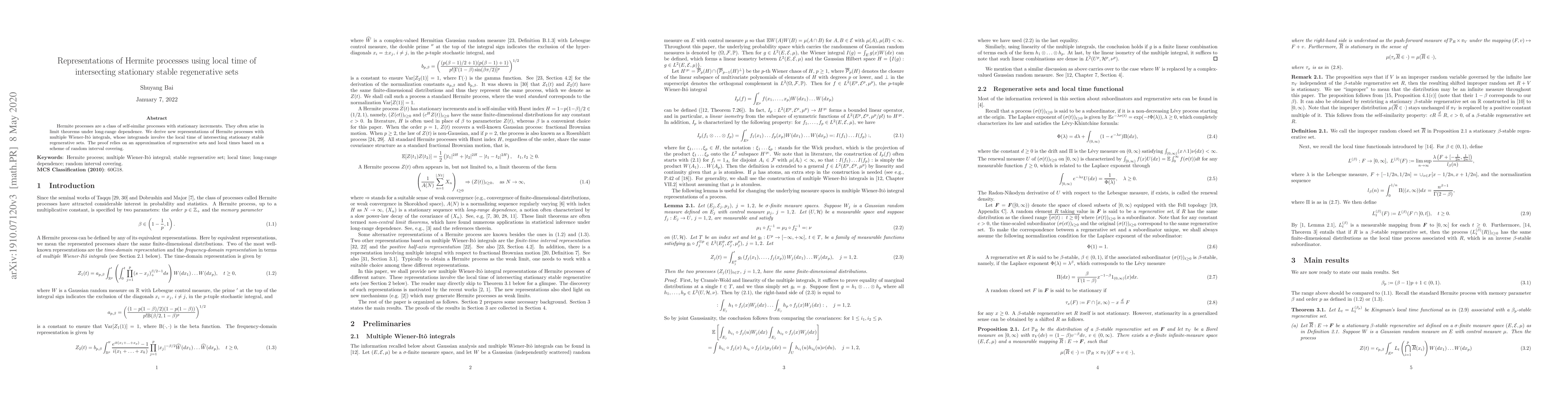 This paper develops new representations of Hermite processes using multiple Wiener-Itô integrals, where the integrands incorporate the local time of intersecting stationary stable regenerative sets. The proof leverages a random interval covering scheme to approximate regenerative sets and local times.
