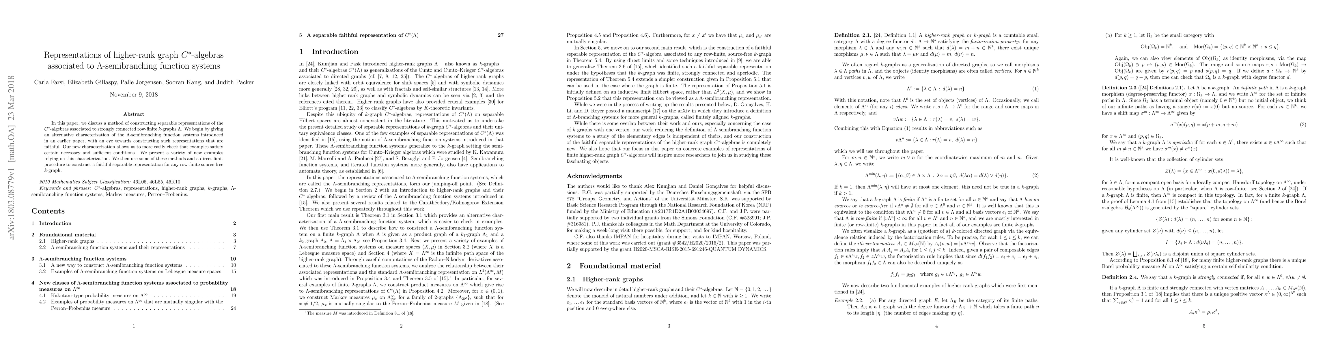 This paper develops a method for constructing separable representations of $C^*$-algebras associated with strongly connected row-finite $k$-graphs, providing an alternative characterization of $\Lambda$-semibranching function systems to facilitate faithful representation construction and presenting new examples. The authors employ these methods to construct a faithful separable representation for any row-finite source-free $k$-graph using a direct limit procedure.