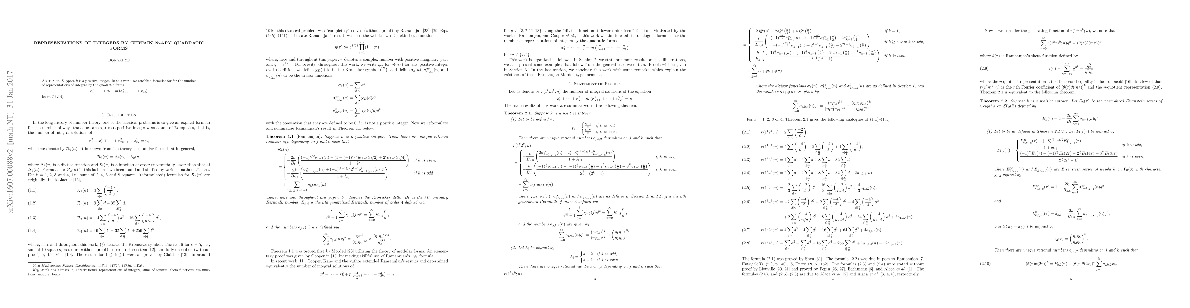 The work presents novel formulas and connections between Eisenstein series, divisor functions, and representation counts of integers by specific $2k$-ary quadratic forms, extending previous results by Ramanujan, Liouville, and others.